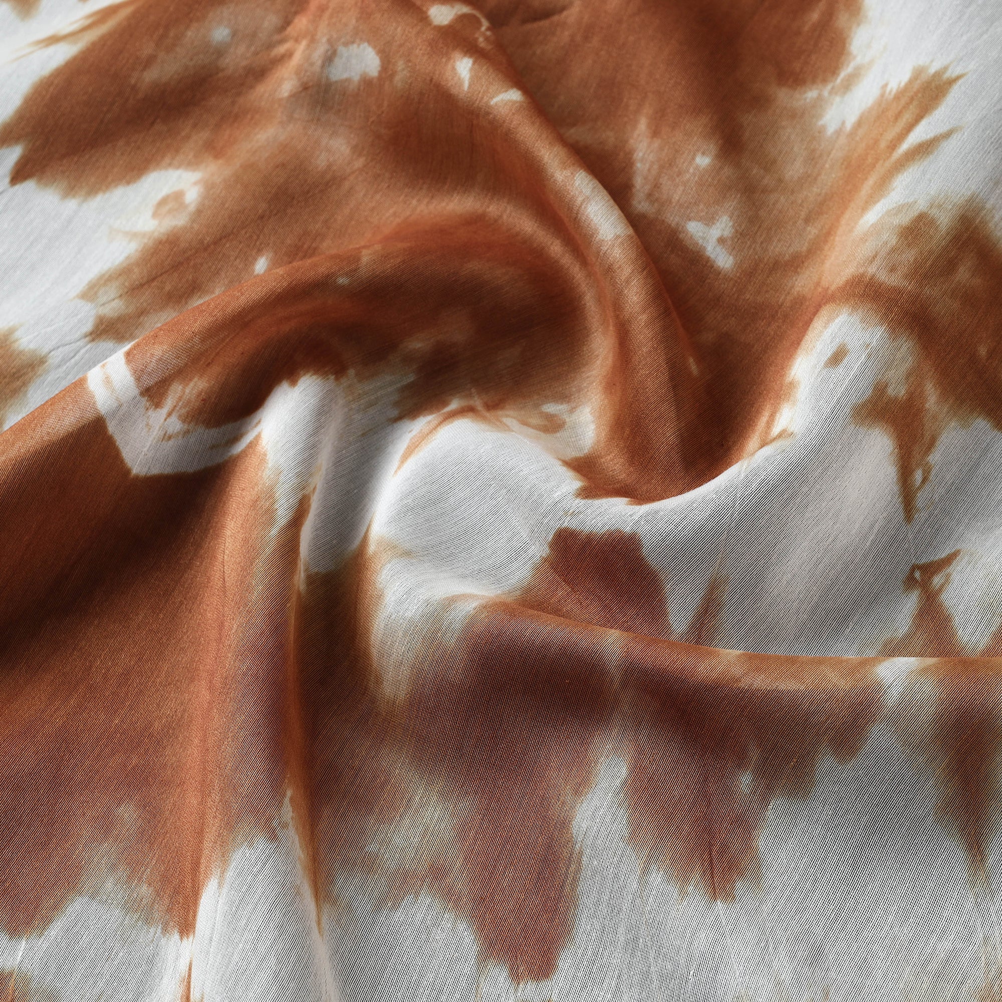 Fine quality brown shibori tie-dye chanderi silk-cotton handloom fabric from Rajasthan. This textile is meticulously crafted from high-quality chanderi silk-cotton blend, known for its delicate sheen and lightweight feel. This fabric is created using the traditional shibori tie and dye technique. Skilled artisans intricately tie the fabric with clamps or stitches, resulting in stunning, unique patterns. The result is a fabric that is not only visually captivating but also incredibly comfortable to wear. Perfect for creating elegant garments, home decor, and accessories, this fabric embodies the rich textile heritage of Rajasthan in every thread.