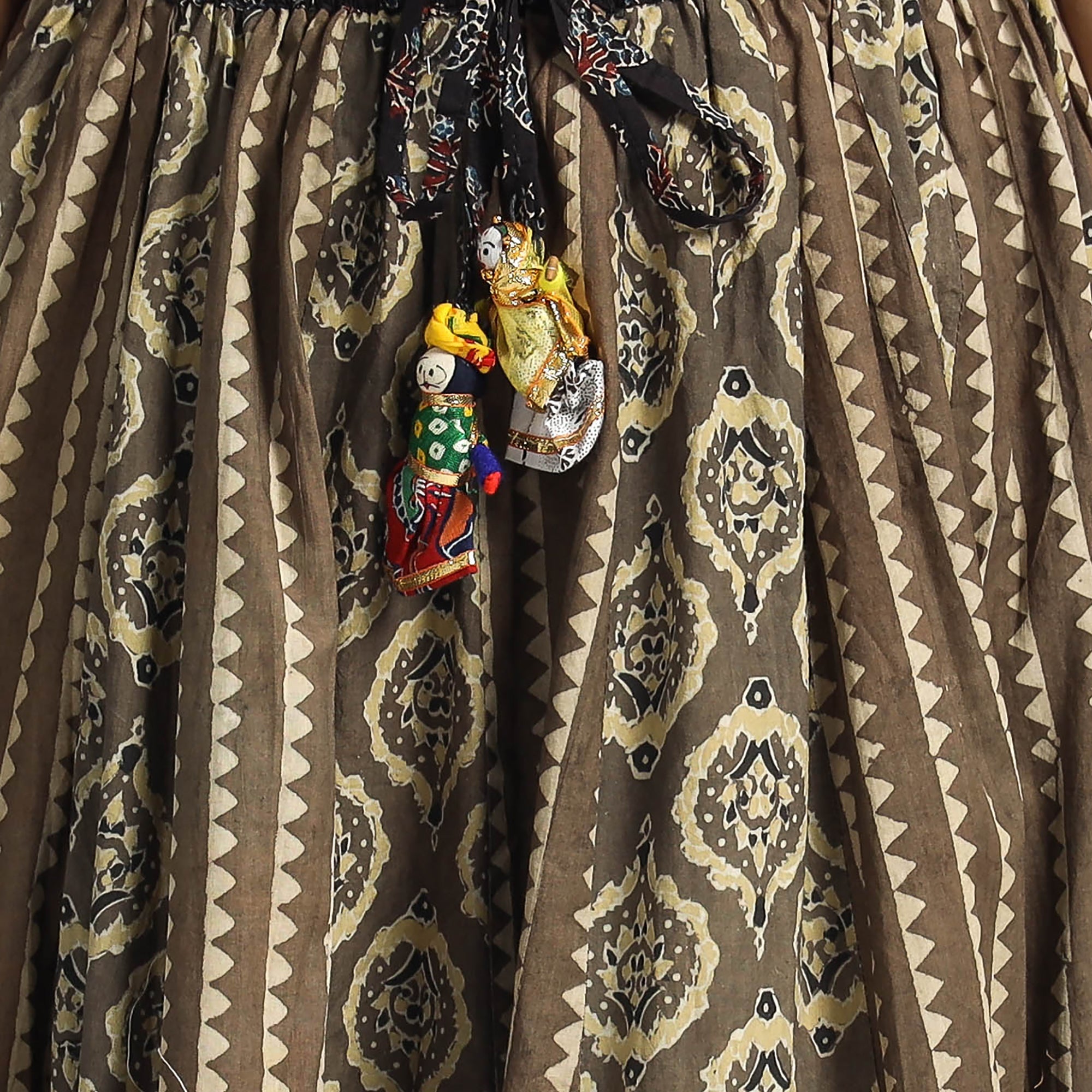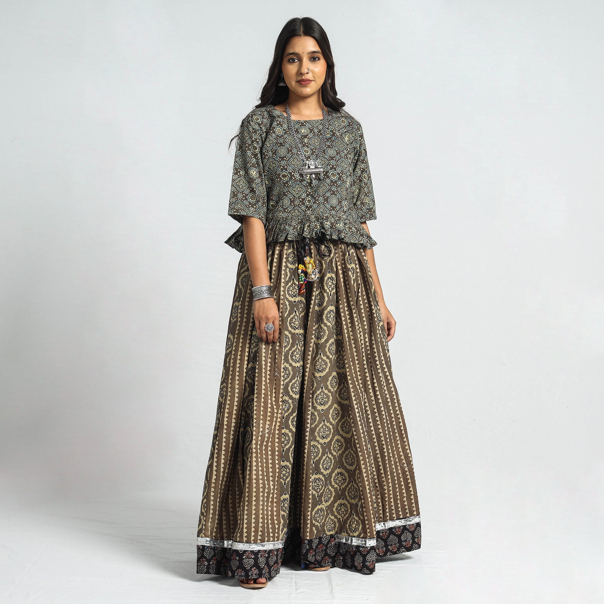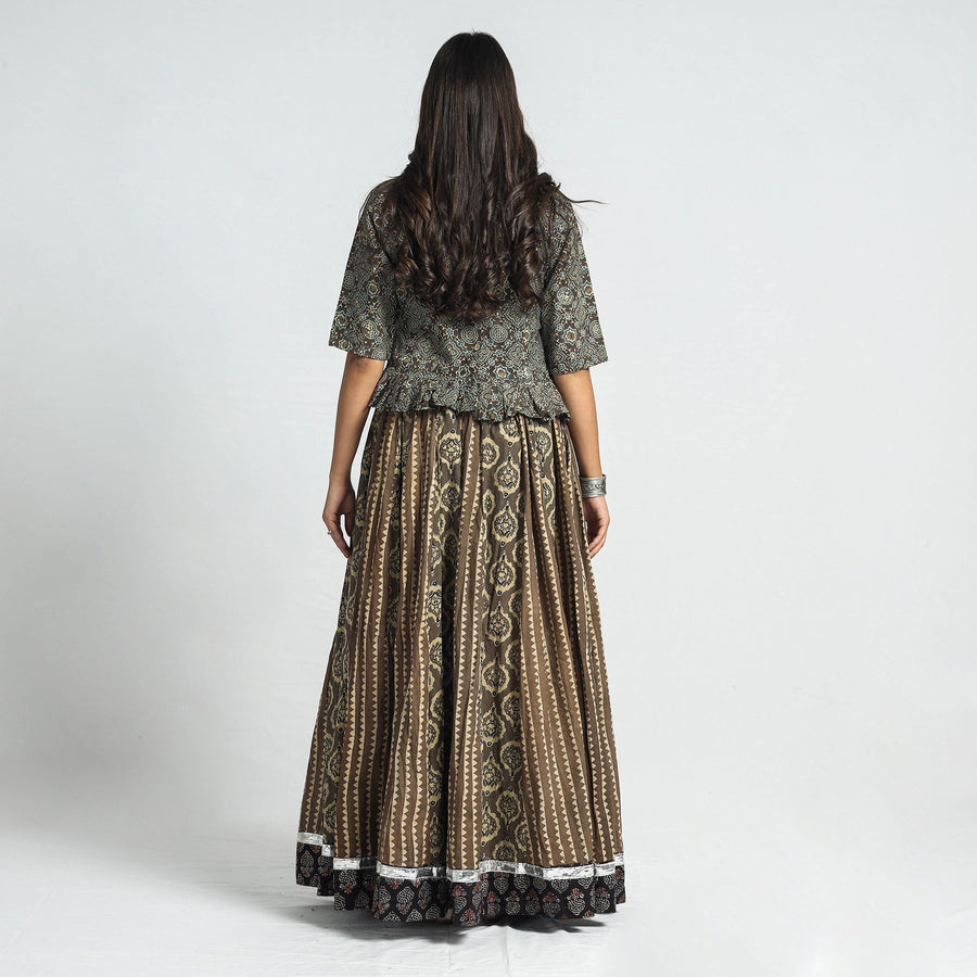 This exquisite brown patchwork cotton long skirt is crafted from ajrakh block-printed, natural-dyed cotton fabric. This skirt boasts a waist tie-up closure, allowing for a customized and comfortable fit. The patchwork kali design adds a unique touch, showcasing the skilled craftsmanship behind its creation. The natural dyes used in the printing process enhance the overall beauty of the garment. The intricate patterns and vibrant colours reflect the cultural heritage of Gujarat. Perfect for both casual and semi-formal occasions.