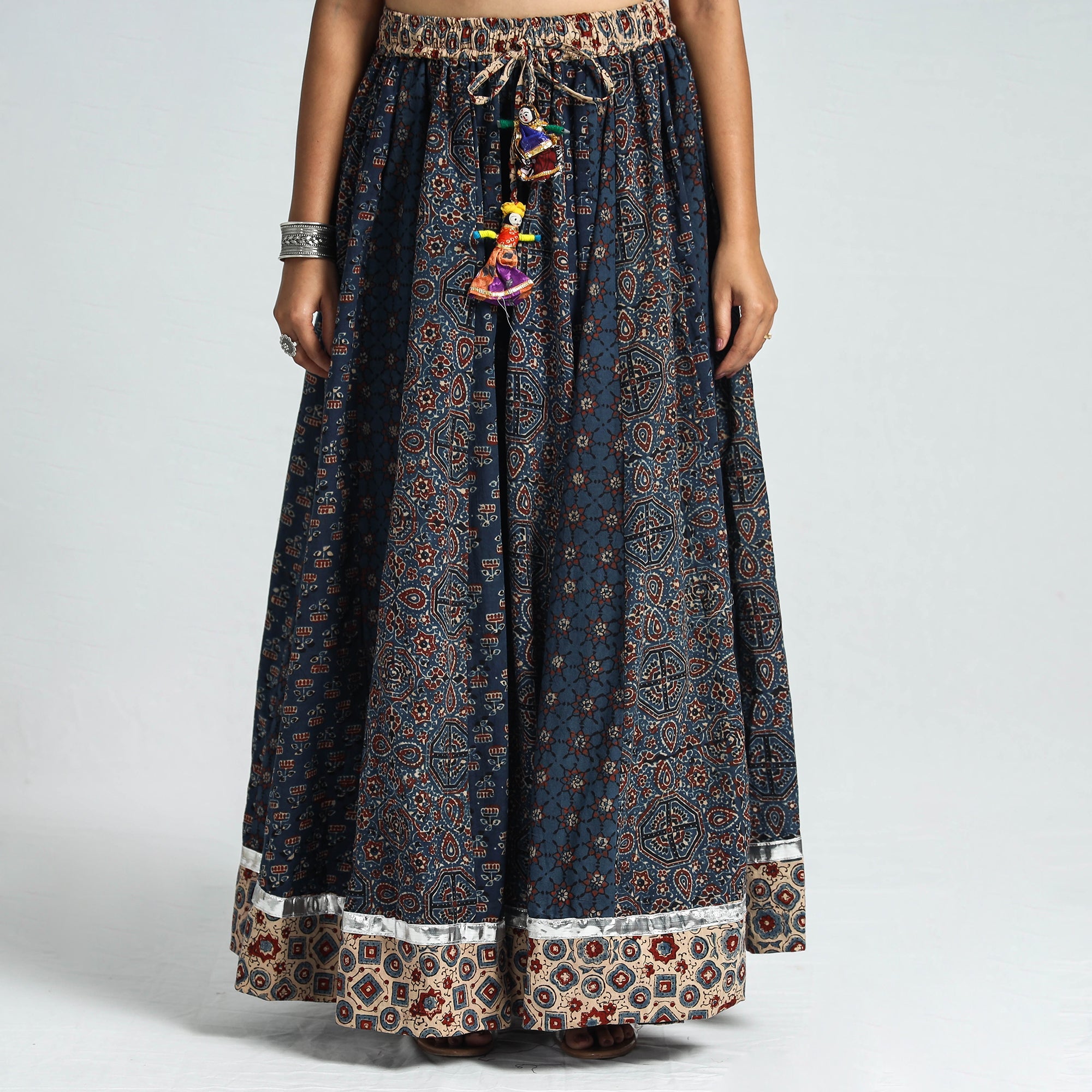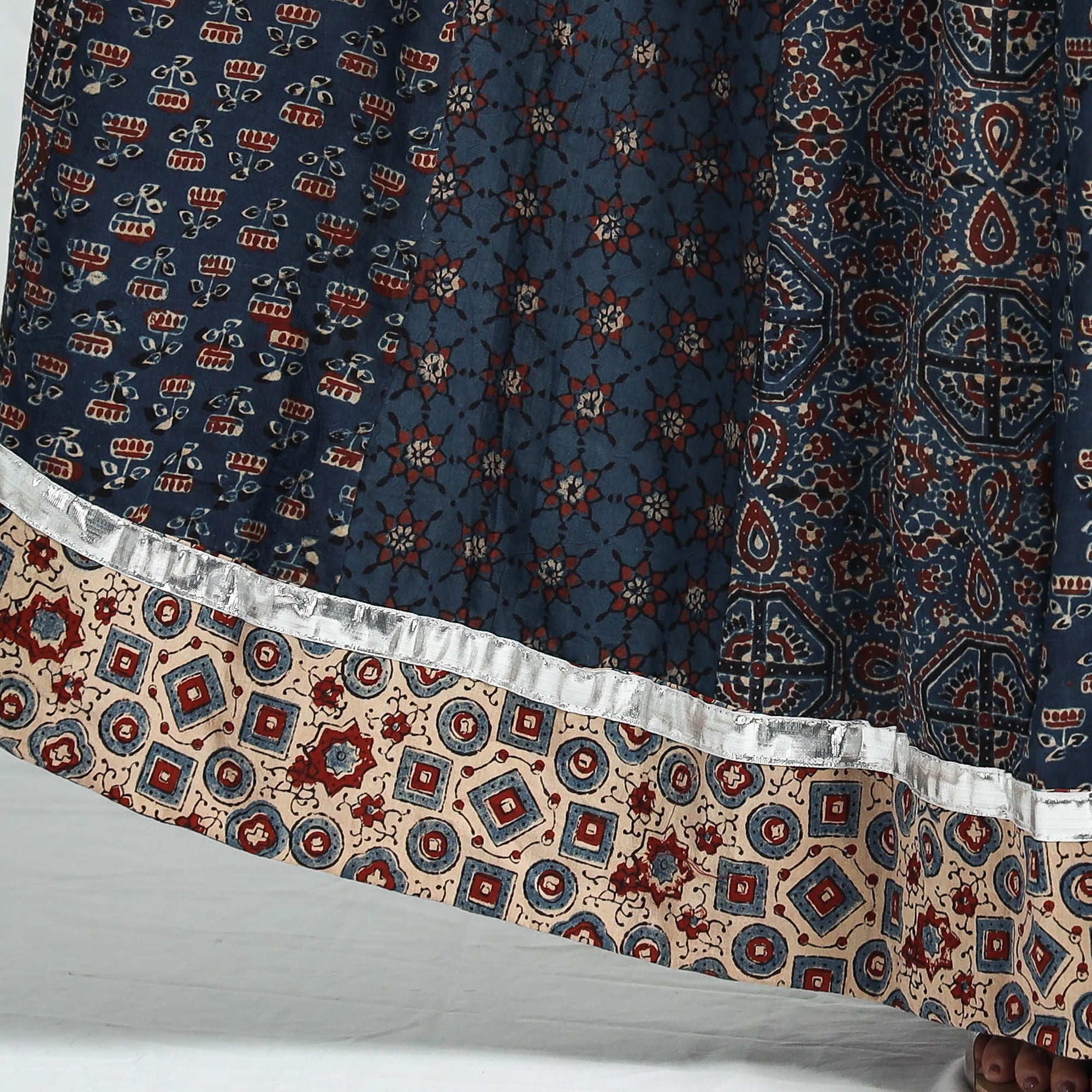 This exquisite blue patchwork cotton long skirt is crafted from ajrakh block-printed, natural-dyed cotton fabric. This skirt boasts a waist tie-up closure, allowing for a customized and comfortable fit. The patchwork kali design adds a unique touch, showcasing the skilled craftsmanship behind its creation. The natural dyes used in the printing process enhance the overall beauty of the garment. The intricate patterns and vibrant colours reflect the cultural heritage of Gujarat. Perfect for both casual and semi-formal occasions.