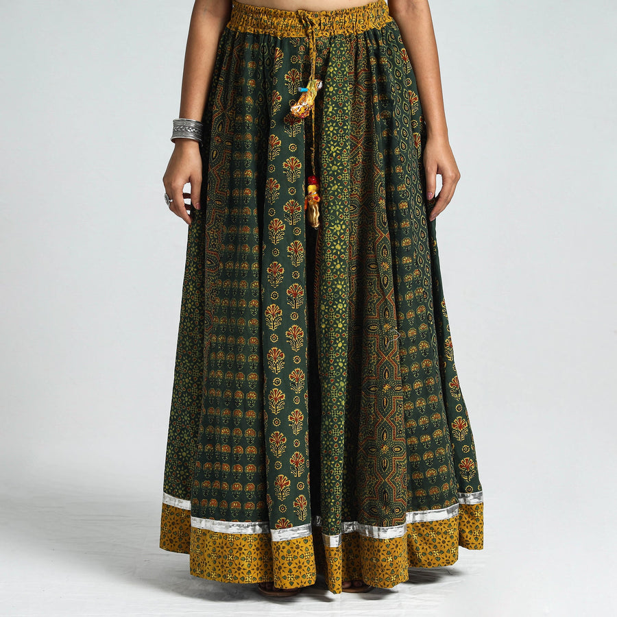 This exquisite green patchwork cotton long skirt is crafted from ajrakh block-printed, natural-dyed cotton fabric. This skirt boasts a waist tie-up closure, allowing for a customized and comfortable fit. The patchwork kali design adds a unique touch, showcasing the skilled craftsmanship behind its creation. The natural dyes used in the printing process enhance the overall beauty of the garment. The intricate patterns and vibrant colours reflect the cultural heritage of Gujarat. Perfect for both casual and semi-formal occasions.