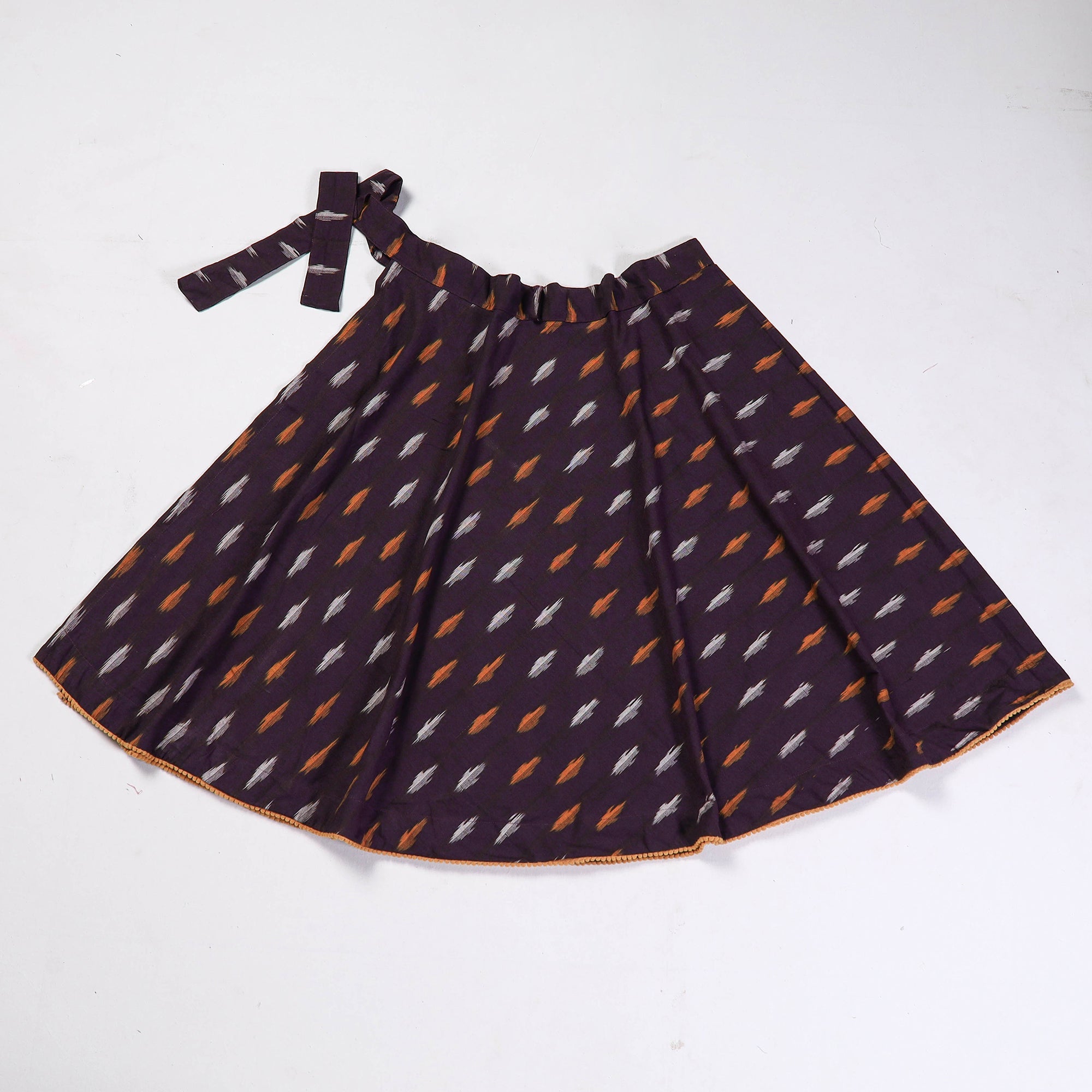 Elevate your style with this fine quality purple pochampally ikat weave pure cotton wrap around skirt. Featuring a waist tie-up closure, this skirt is not only stylish but also comfortable to wear. The ikat dyeing technique used in this skirt creates beautiful patterns and designs, making it a standout piece in your wardrobe. Step out in style with this exquisite pochampally ikat wrap around skirt that showcases the beauty of traditional Indian textiles and craftsmanship.