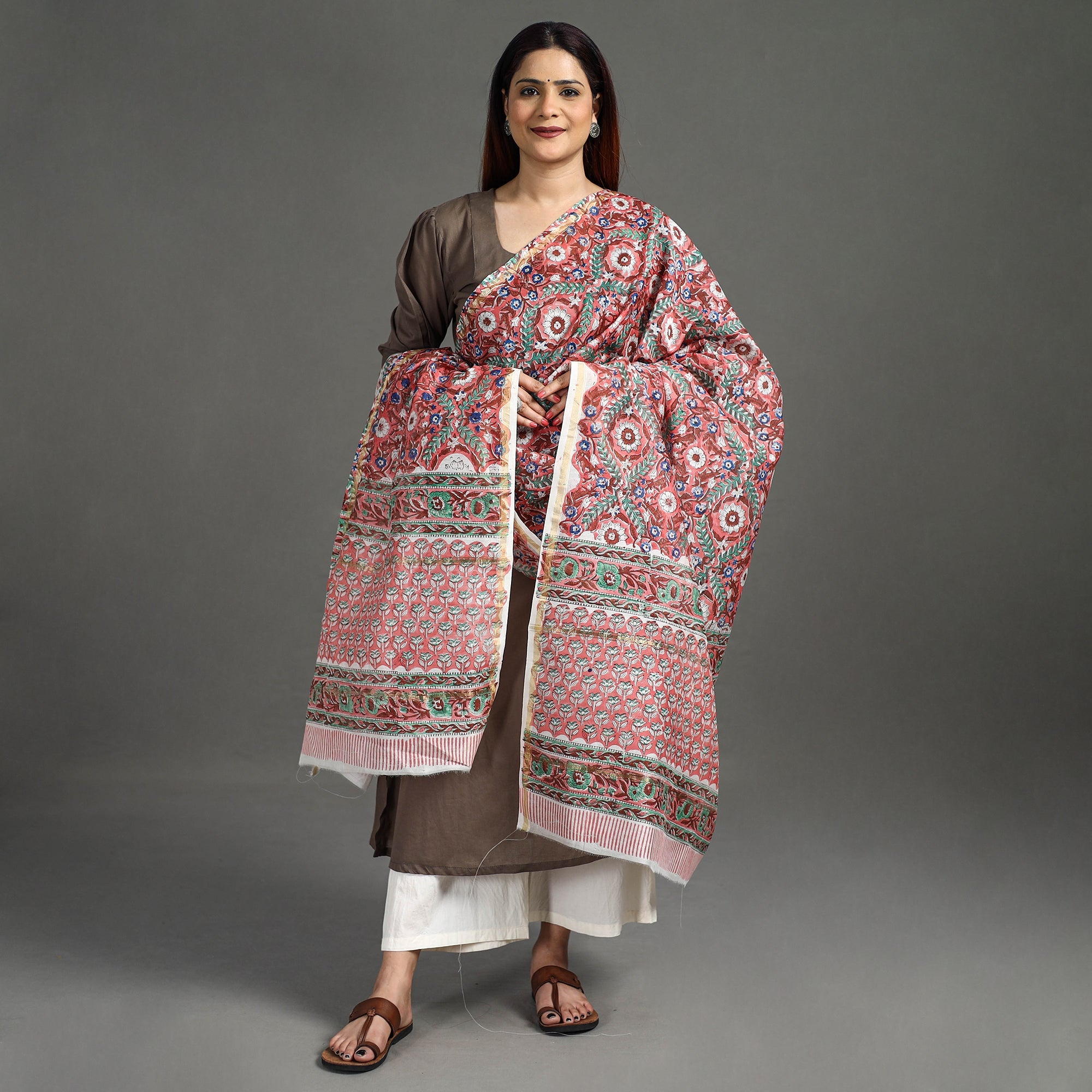 Fine quality sanganeri hand block printed handloom chanderi silk dupatta with zari border. made using bleed-free VAT dyes. Sanganeri is a hand-block printing technique originating from Sanganer, a village in the southern part of Jaipur, Rajasthan. Chanderi silks are known for its gossamer looks and amazing feel. Chanderi weaving is practiced in the historic town of Chanderi in Madhya Pradesh.