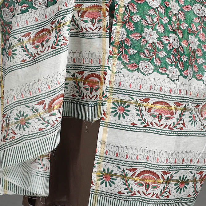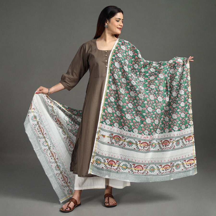 Fine quality sanganeri hand block printed handloom chanderi silk dupatta with zari border. made using bleed-free VAT dyes. Sanganeri is a hand-block printing technique originating from Sanganer, a village in the southern part of Jaipur, Rajasthan. Chanderi silks are known for its gossamer looks and amazing feel. Chanderi weaving is practiced in the historic town of Chanderi in Madhya Pradesh.