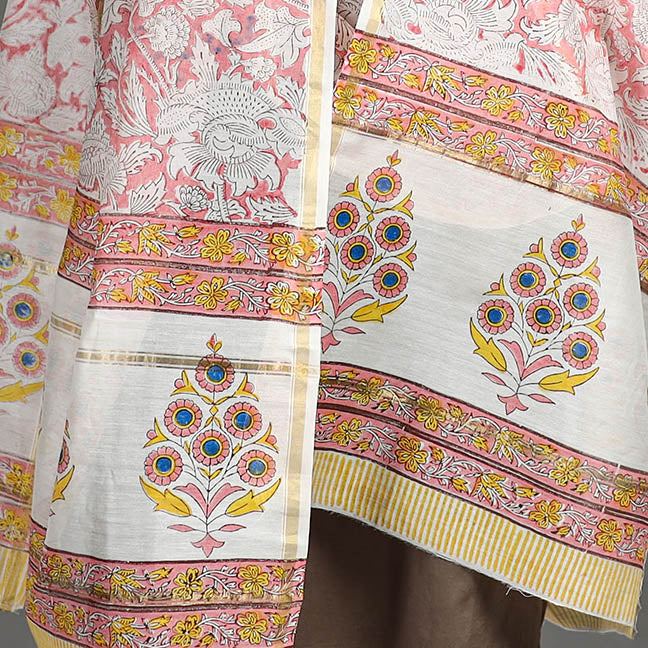 Fine quality sanganeri hand block printed handloom chanderi silk dupatta with zari border. made using bleed-free VAT dyes. Sanganeri is a hand-block printing technique originating from Sanganer, a village in the southern part of Jaipur, Rajasthan. Chanderi silks are known for its gossamer looks and amazing feel. Chanderi weaving is practiced in the historic town of Chanderi in Madhya Pradesh.