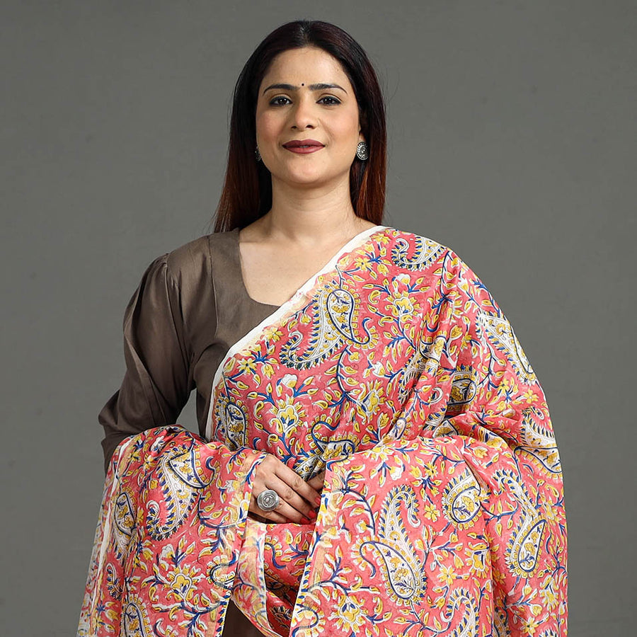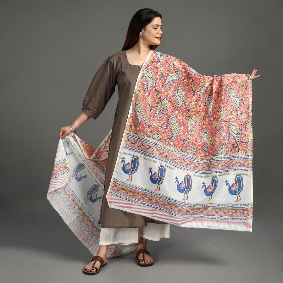 Fine quality sanganeri hand block printed handloom chanderi silk dupatta with zari border. made using bleed-free VAT dyes. Sanganeri is a hand-block printing technique originating from Sanganer, a village in the southern part of Jaipur, Rajasthan. Chanderi silks are known for its gossamer looks and amazing feel. Chanderi weaving is practiced in the historic town of Chanderi in Madhya Pradesh.