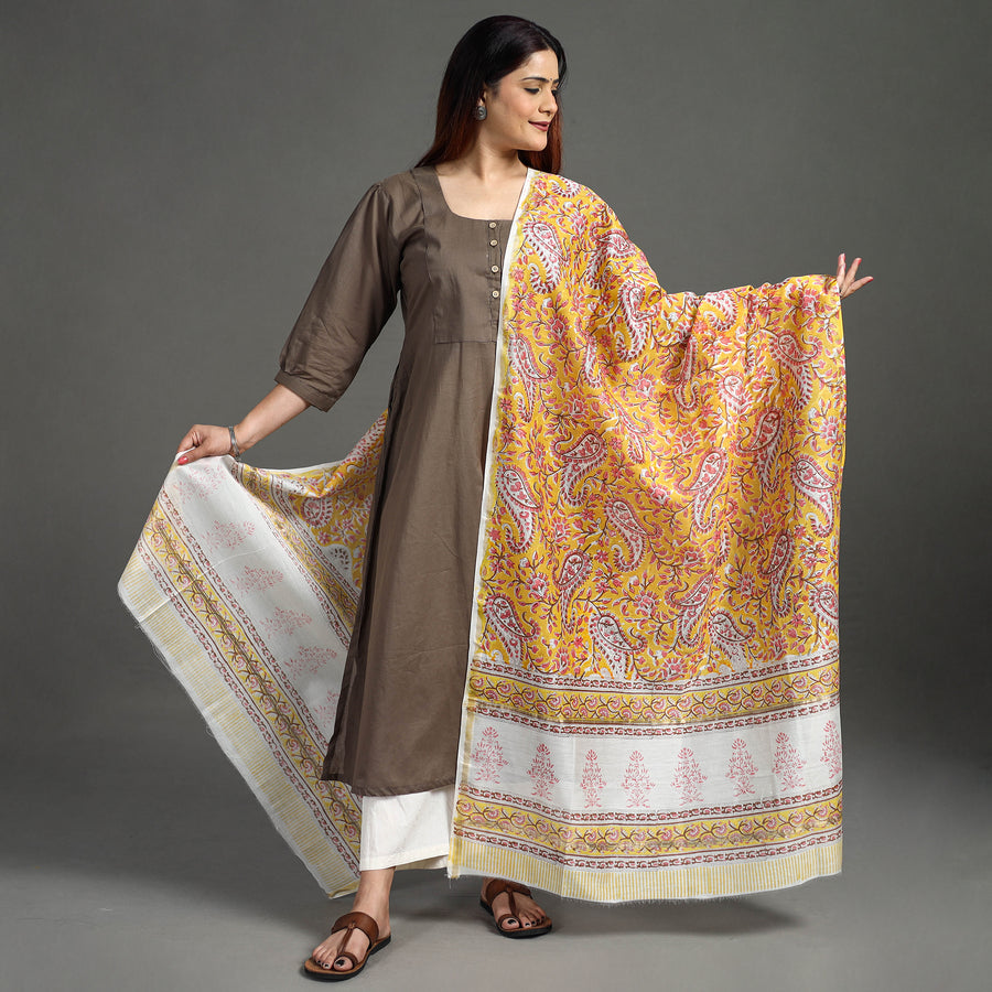 Fine quality sanganeri hand block printed handloom chanderi silk dupatta with zari border. made using bleed-free VAT dyes. Sanganeri is a hand-block printing technique originating from Sanganer, a village in the southern part of Jaipur, Rajasthan. Chanderi silks are known for its gossamer looks and amazing feel. Chanderi weaving is practiced in the historic town of Chanderi in Madhya Pradesh.