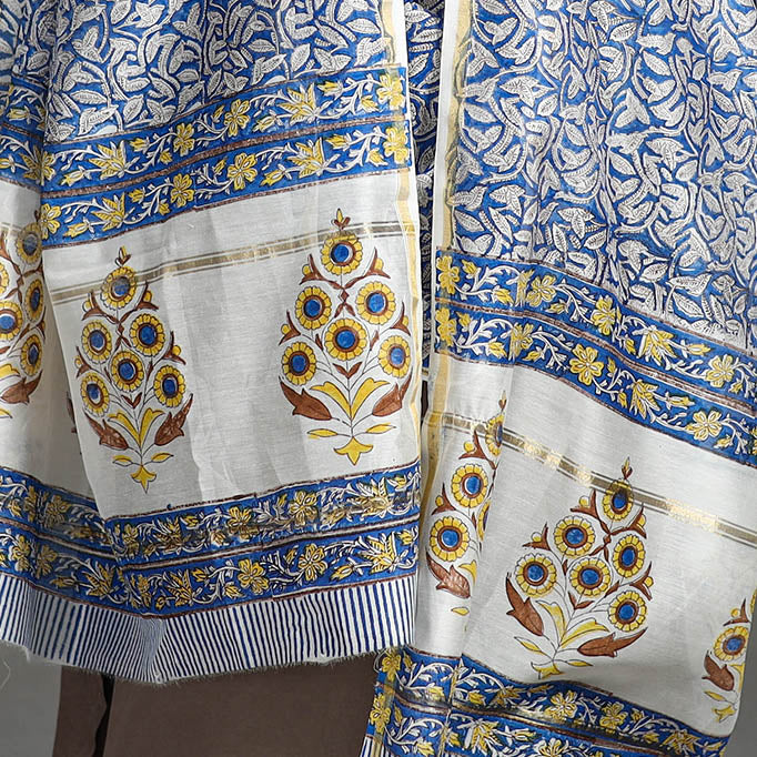 Blue - Handloom Chanderi Silk Sanganeri Print Dupatta 05