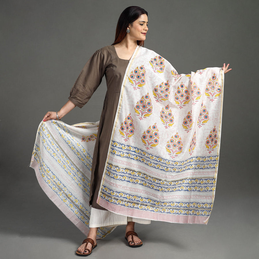 Fine quality sanganeri hand block printed handloom chanderi silk dupatta with zari border. made using bleed-free VAT dyes. Sanganeri is a hand-block printing technique originating from Sanganer, a village in the southern part of Jaipur, Rajasthan. Chanderi silks are known for its gossamer looks and amazing feel. Chanderi weaving is practiced in the historic town of Chanderi in Madhya Pradesh.