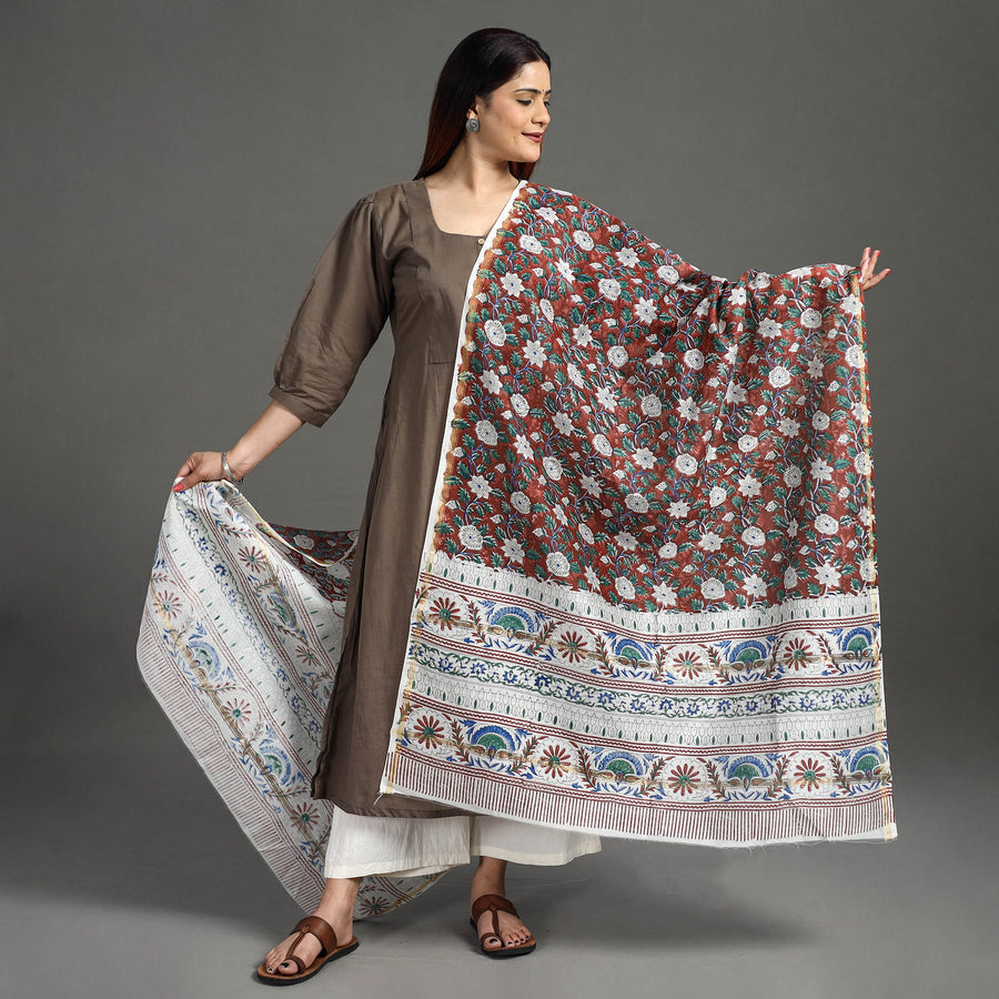 Fine quality sanganeri hand block printed handloom chanderi silk dupatta with zari border. made using bleed-free VAT dyes. Sanganeri is a hand-block printing technique originating from Sanganer, a village in the southern part of Jaipur, Rajasthan. Chanderi silks are known for its gossamer looks and amazing feel. Chanderi weaving is practiced in the historic town of Chanderi in Madhya Pradesh.