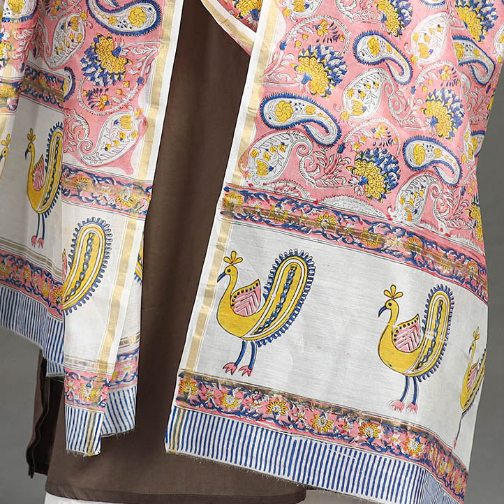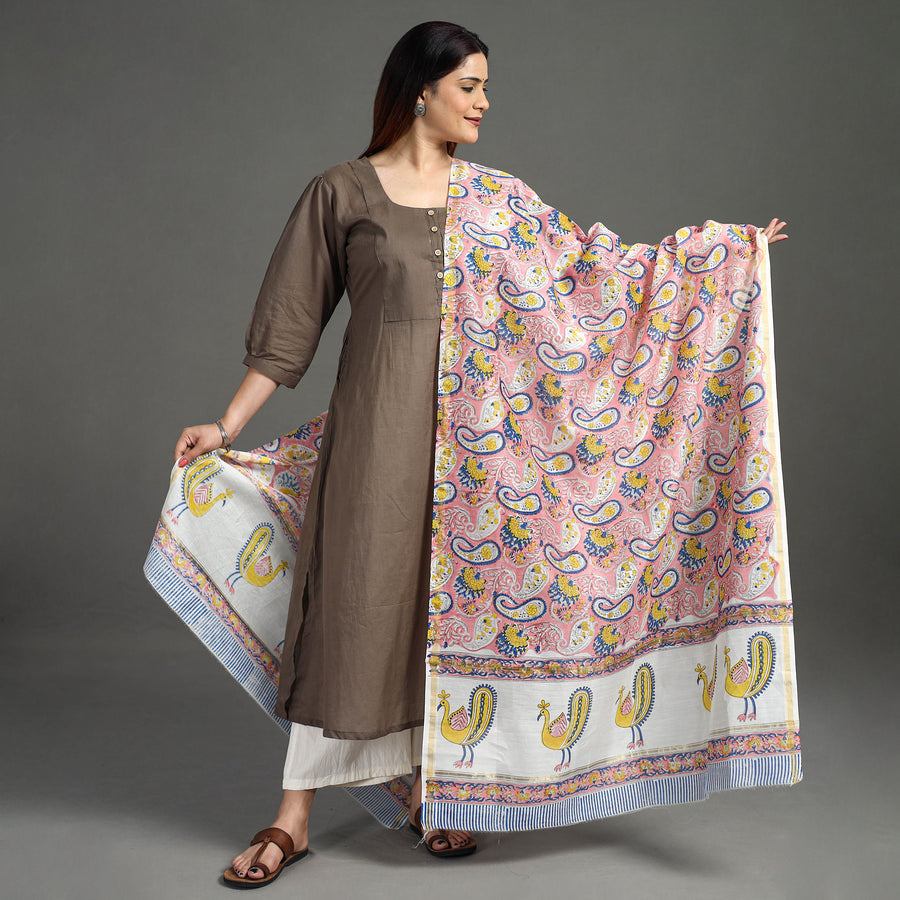 Fine quality sanganeri hand block printed handloom chanderi silk dupatta with zari border. made using bleed-free VAT dyes. Sanganeri is a hand-block printing technique originating from Sanganer, a village in the southern part of Jaipur, Rajasthan. Chanderi silks are known for its gossamer looks and amazing feel. Chanderi weaving is practiced in the historic town of Chanderi in Madhya Pradesh.