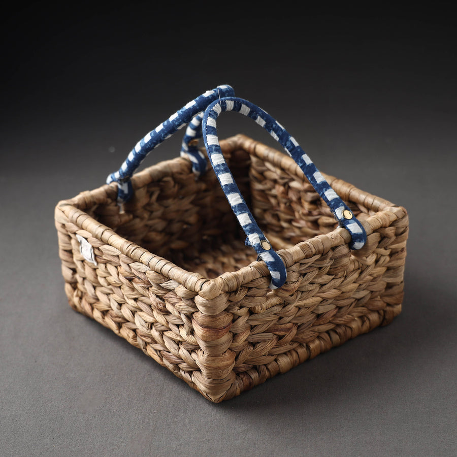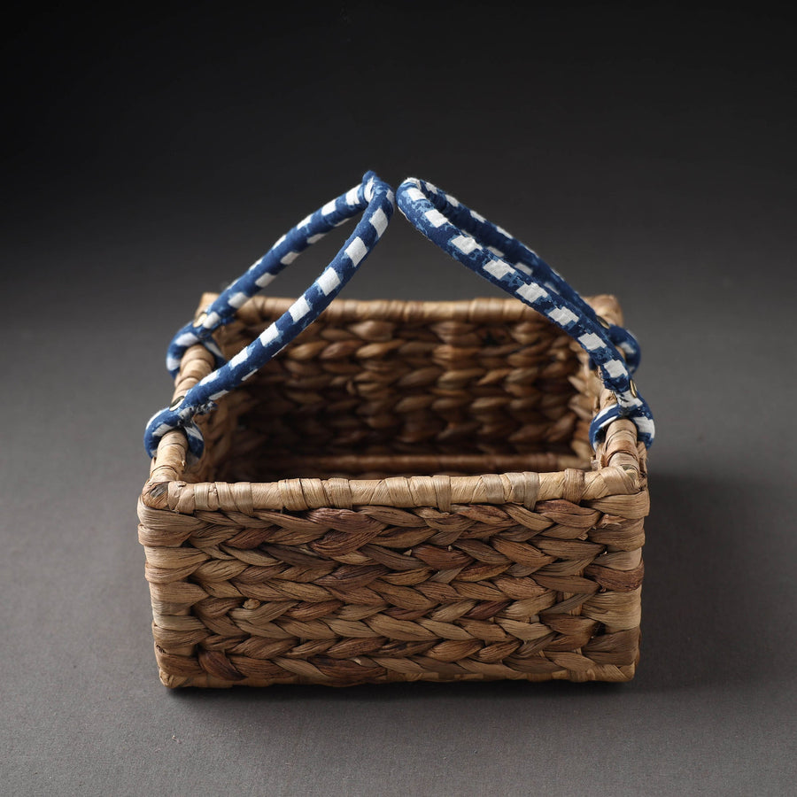 brown Handcrafted organic water hyacinth regal basket with cotton handle featuring a sturdy metal frame that is intricately detailed with unique patterns made from naturally dried water hyacinth reed fibre. The intricate patterns are achieved through a meticulous handcrafting process, where skilled artisans carefully weave the naturally dried water hyacinth reed fibers together to create a sturdy and durable basket. Water hyacinth is a fast-growing aquatic plant, making it a sustainable and eco-friendly material choice for this basket. Elevate your home organization with this handcrafted regal basket - perfect for storage, decor, and style.