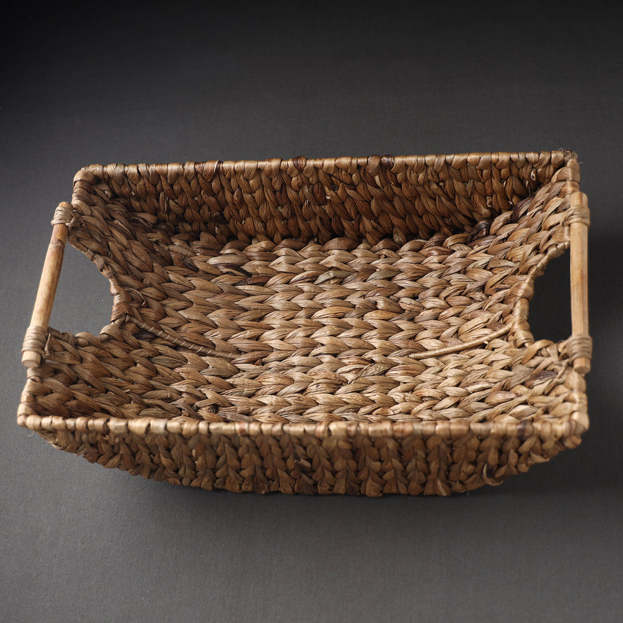 brown Handcrafted organic water hyacinth multipurpose boat basket featuring a sturdy metal frame that is intricately detailed with unique patterns made from naturally dried water hyacinth reed fibre. The intricate patterns are achieved through a meticulous handcrafting process, where skilled artisans carefully weave the naturally dried water hyacinth reed fibers together to create a sturdy and durable tray. Water hyacinth is a fast-growing aquatic plant, making it a sustainable and eco-friendly material choice for this tray. Elevate your home decor and organization with this handcrafted multipurpose boat basket.