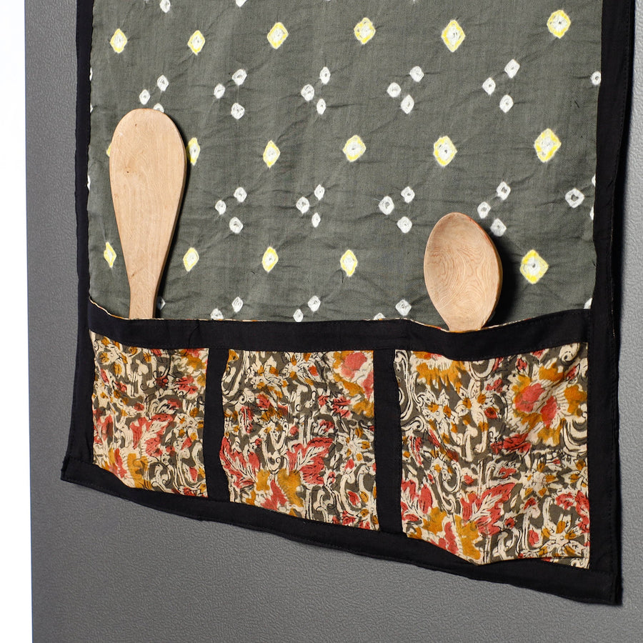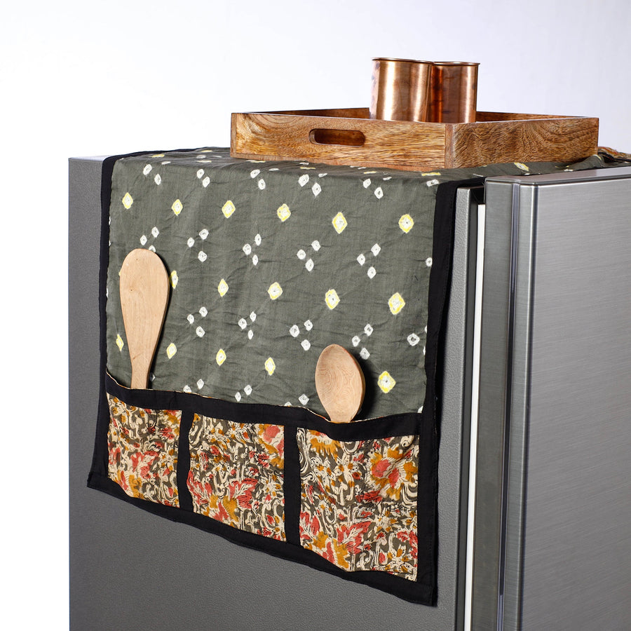 This grey bandhani tie dye cotton fridge top cover is textured with handmade textiles from India. It features six utility side pockets to keep your daily essentials organized. Perfect for adding a touch of traditional Indian style to your kitchen while keeping it organized.