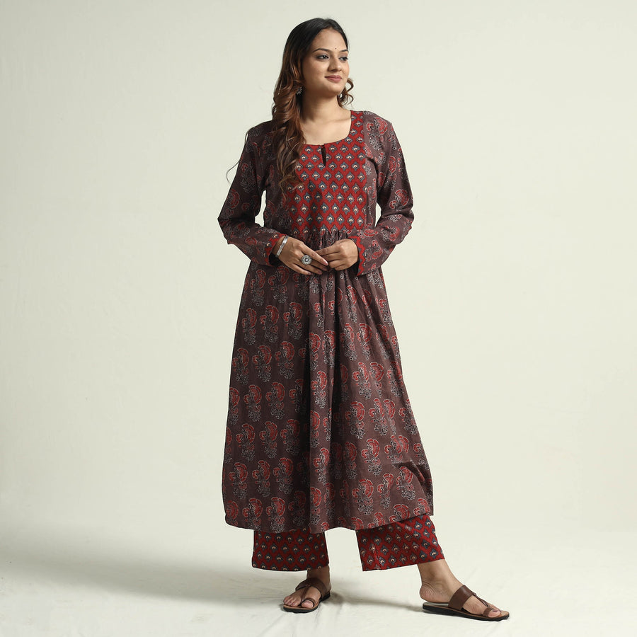 Elevate your style with our ajrakh block printed cotton flared kurta with palazzo set. Crafted from exquisite ajrakh hand block printed natural dyed cotton, this set combines tradition with contemporary flair. The flared kurta adds a touch of elegance, while the elasticized waist and convenient two side pockets in the palazzo ensure comfort and functionality. Perfect for casual outings, festive occasions, or simply embracing a trendy ethnic look, this set is a must-have addition to your wardrobe.