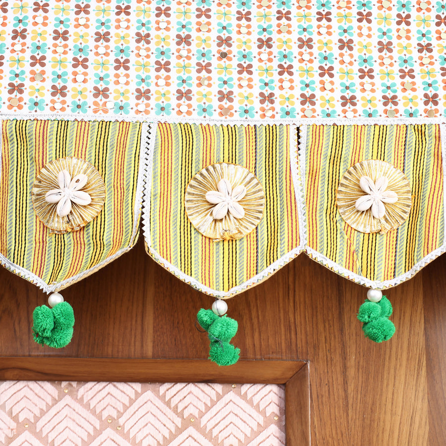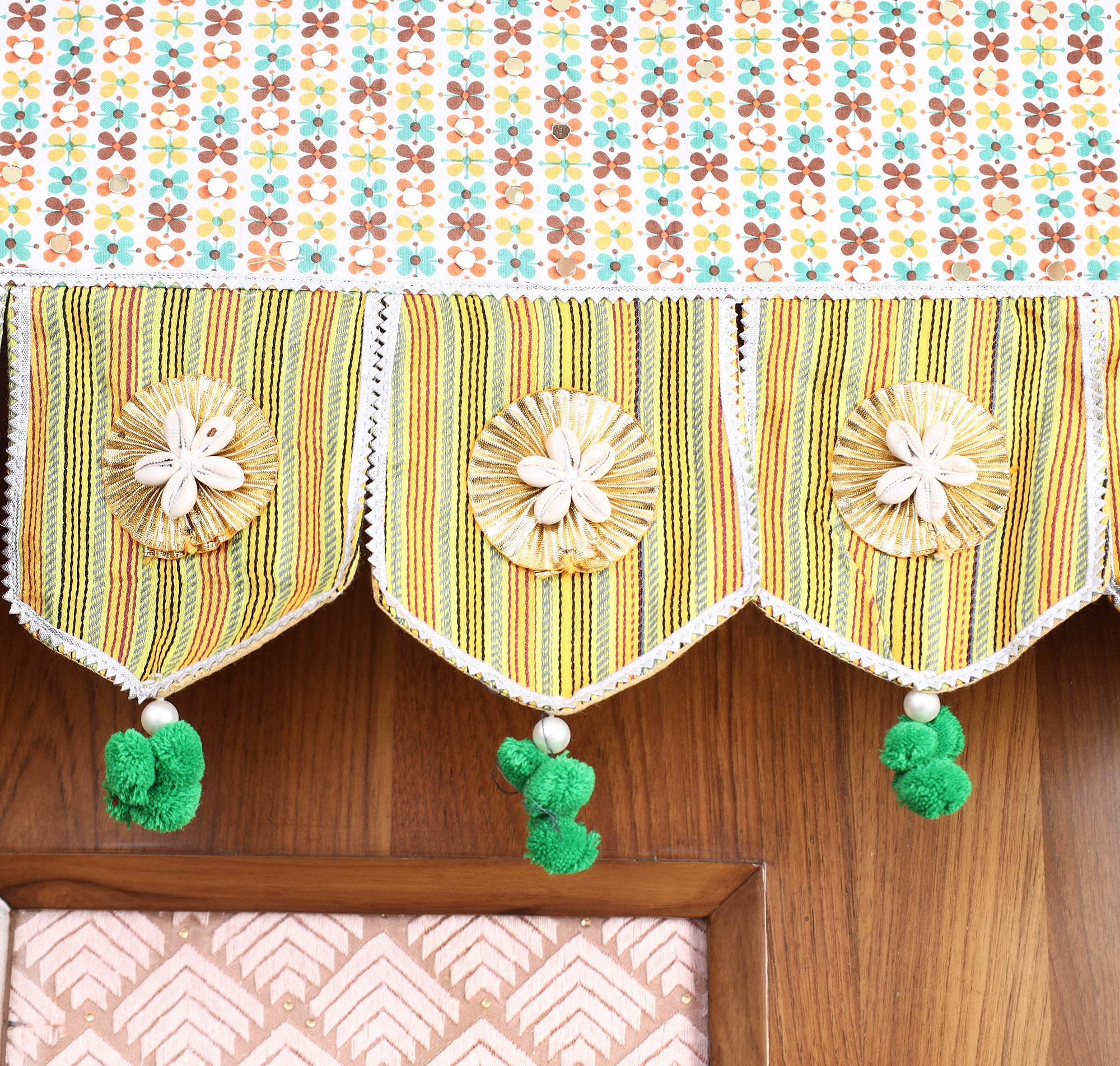 This exquisite hand block printed toran hanging is a blend of mixed materials, including hand painted wooden, gota patti and bead work. It serves as a captivating and traditional adornment. It is an excellent decoration for the entrance of your house.