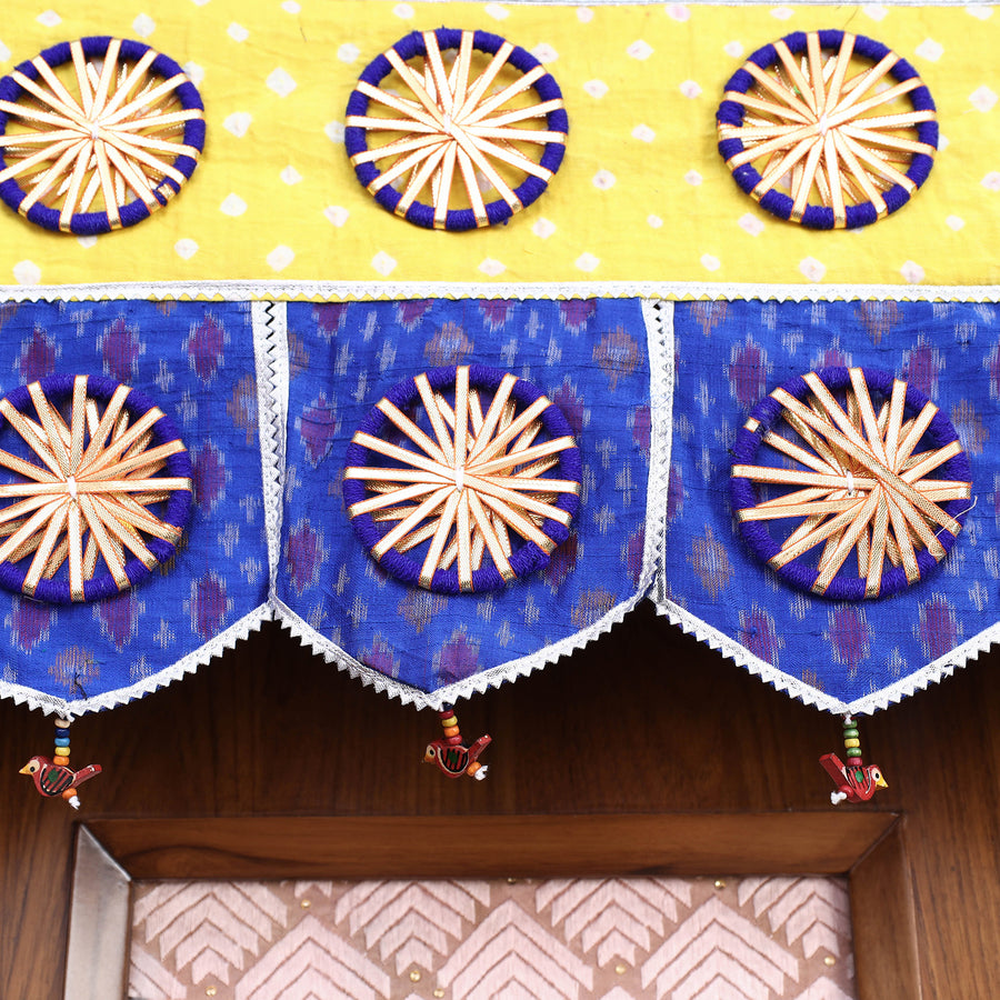 This exquisite hand block printed toran hanging is a blend of mixed materials, including hand painted wooden, gota patti and bead work. It serves as a captivating and traditional adornment. It is an excellent decoration for the entrance of your house.