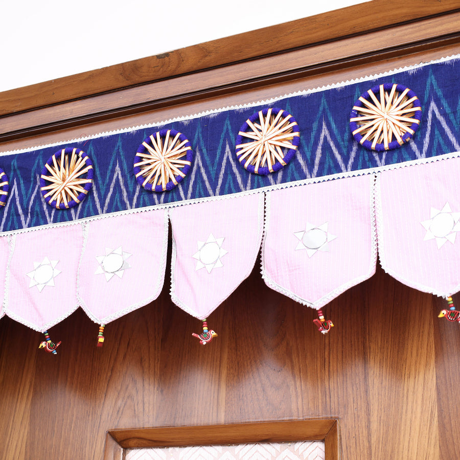 This exquisite hand block printed toran hanging is a blend of mixed materials, including hand painted wooden, gota patti and bead work. It serves as a captivating and traditional adornment. It is an excellent decoration for the entrance of your house.