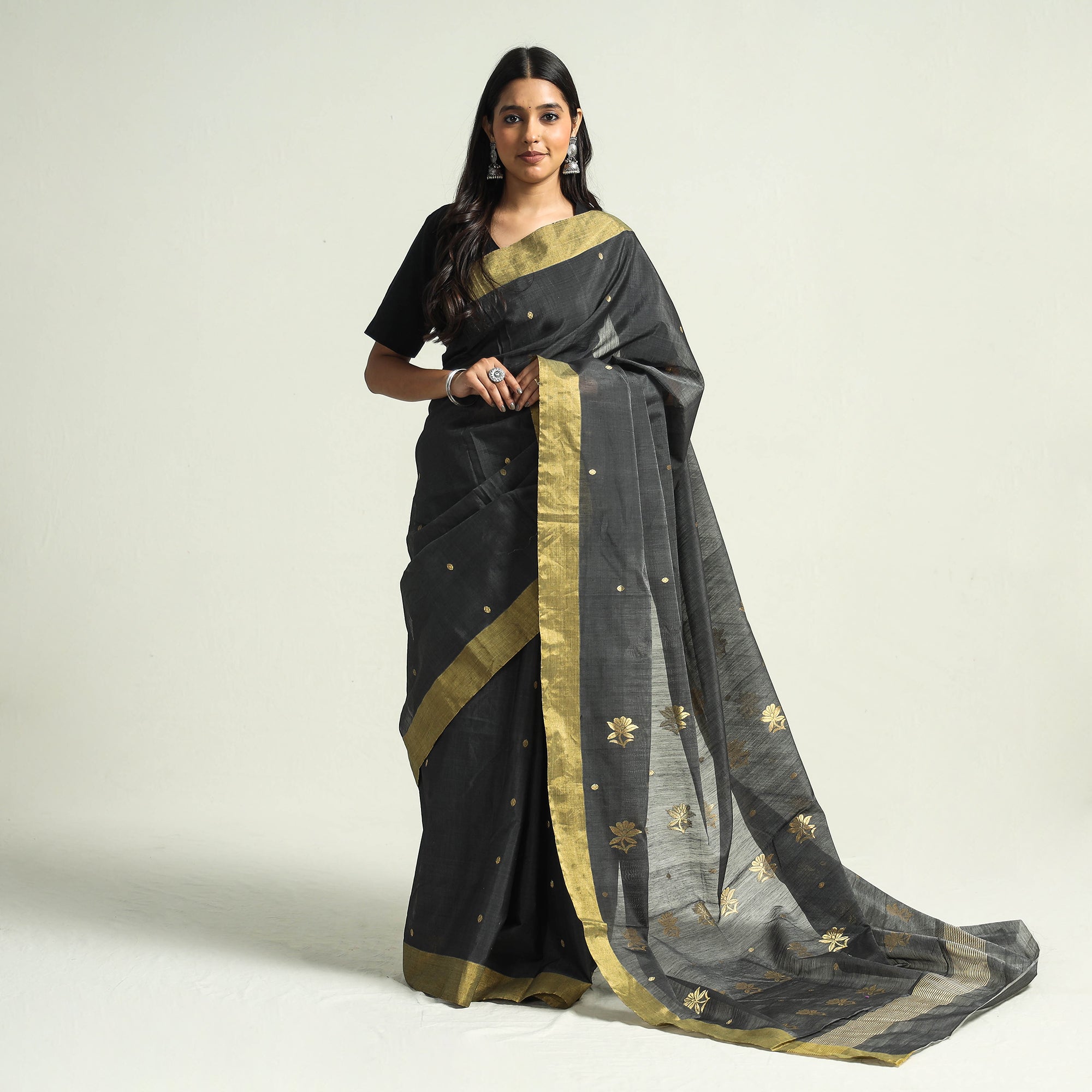 This traditional chanderi silk-cotton handloom saree is crafted from the finest quality silk and mercerized cotton blend with a zari border and buta. It features a luxurious zari border and meticulously woven buta (motifs), showcasing the rich textile heritage of Chanderi, Madhya Pradesh. This exquisite saree is skillfully handwoven using traditional chanderi weaving techniques by master artisan Rauph Khan. Each buta and border pattern is meticulously crafted using separate needles, showcasing the artisan's precision and expertise. This chanderi silk-cotton saree offers unparalleled comfort due to its lightweight and breathable fabric. The blend of silk and cotton ensures a soft and gentle drape, making it comfortable for all-day wear. It's an ideal choice for elegant gatherings and special occasions.