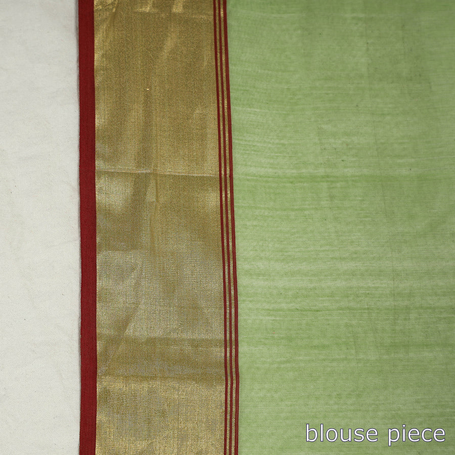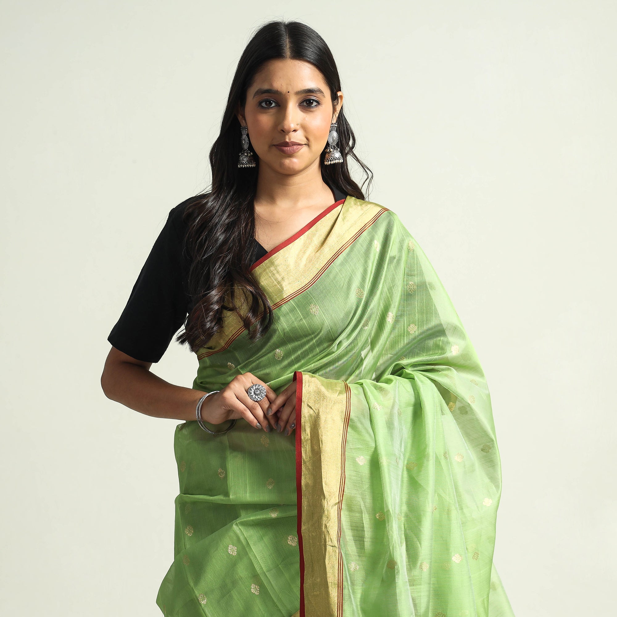 This traditional chanderi silk-cotton handloom saree is crafted from the finest quality silk and mercerized cotton blend with a zari border and buti. It features a luxurious zari border and meticulously woven buta (motifs), showcasing the rich textile heritage of Chanderi, Madhya Pradesh. This exquisite saree is skillfully handwoven using traditional chanderi weaving techniques by master artisan Rauph Khan. Each buta and border pattern is meticulously crafted using separate needles, showcasing the artisan's precision and expertise. This chanderi silk-cotton saree offers unparalleled comfort due to its lightweight and breathable fabric. The blend of silk and cotton ensures a soft and gentle drape, making it comfortable for all-day wear. It's an ideal choice for elegant gatherings and special occasions.