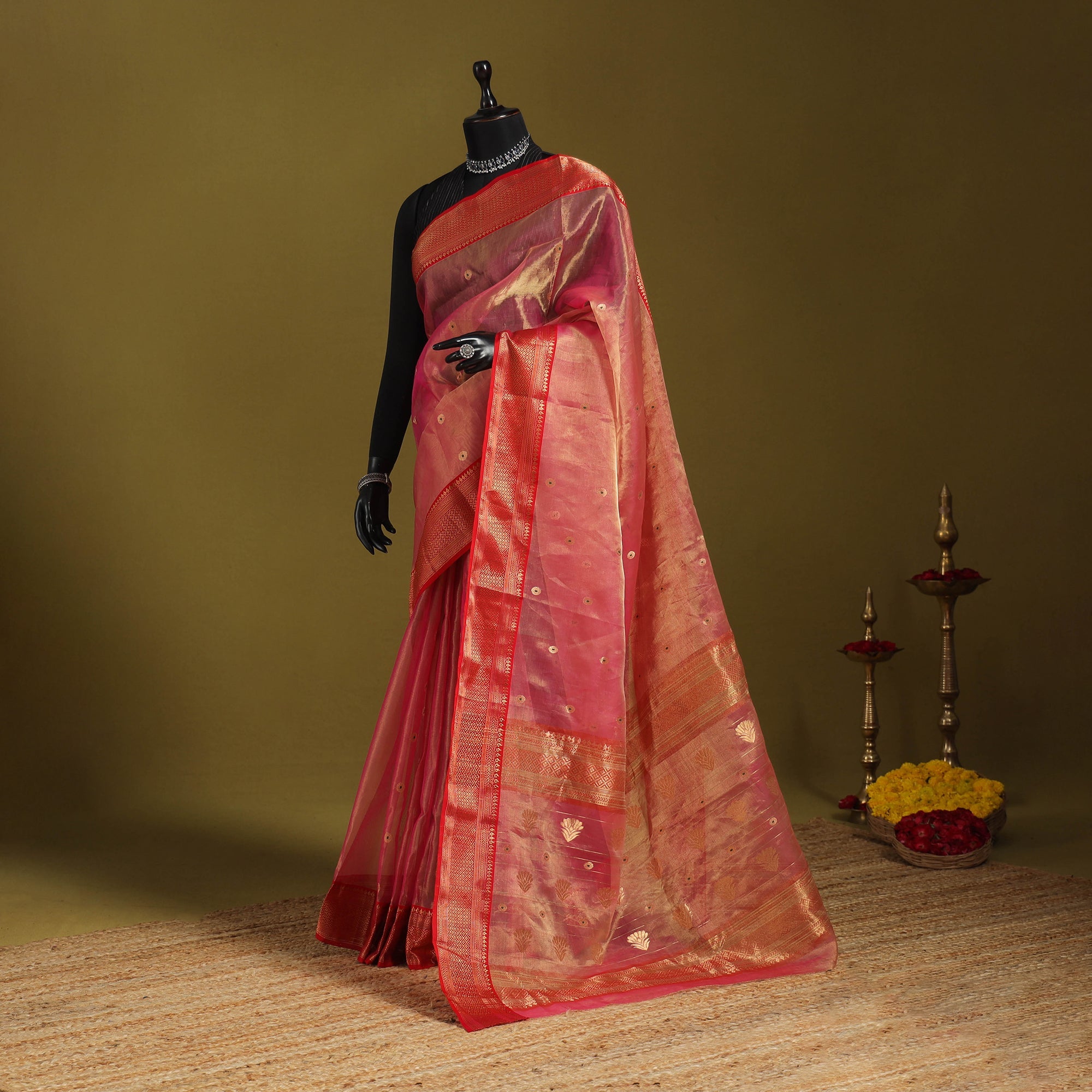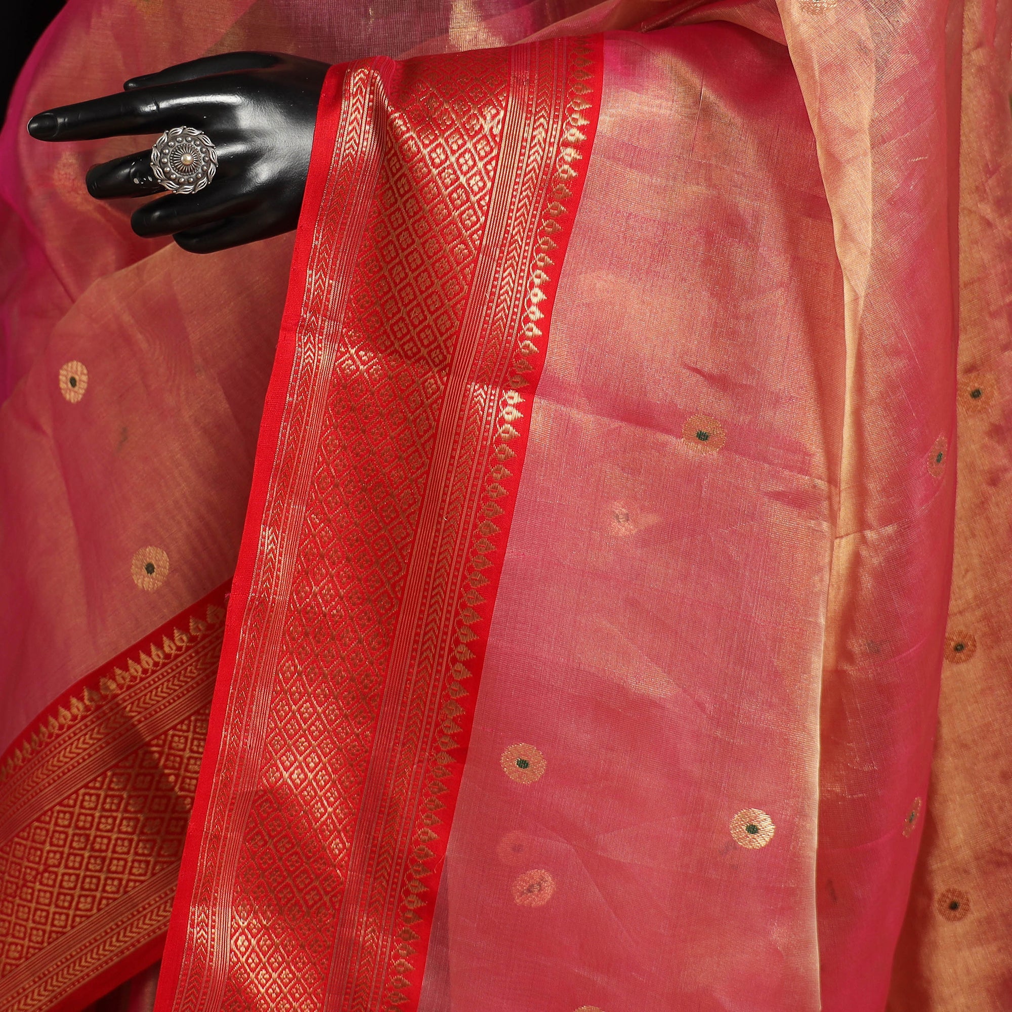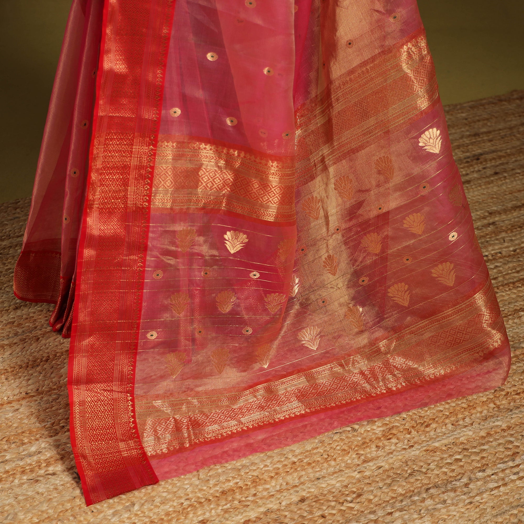 This traditional pink chanderi katan silk tissue zari weave handloom saree is crafted from the finest quality katan silk and tissue zari blend with a nakshi zari border and buta. It features a luxurious zari border and meticulously woven buta (motifs), showcasing the rich textile heritage of Chanderi, Madhya Pradesh. This exquisite saree is skillfully handwoven using traditional Chanderi weaving techniques by master artisan Rauph Khan. Each buta and border pattern is meticulously crafted using separate needles, showcasing the artisan's precision and expertise. This chanderi katan silk tissue zari weave saree offers unparalleled softness and lightweight feel, ensuring ease of wear throughout the day or evening. The exquisite zari work adds a regal touch, making it perfect for special occasions and celebrations.