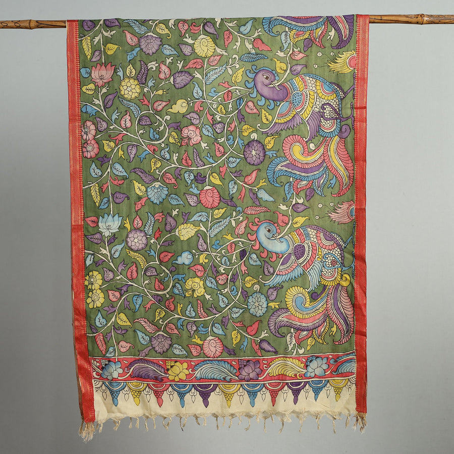 Fine quality srikalahasti pen work handpainted kalamkari chanderi silk-cotton zari border dupatta with tassels. This exquisite dupatta is created with srikalahasti style of kalamkari, wherein the "kalam" or pen is used for free hand drawing of the subject and filling in the colours. It is entirely hand worked using natural colours. Kalamkari in srikalahasti has been around for 200 years approximately. Unlike other places where this particular craft is practiced, artists in srikalahasti retains the ancient techniques of dyeing which have been passed down from generations. As it is hand-painted/handcrafted, colour spread and irregularity in design is common, hence it won't be considered as damaged or defective.