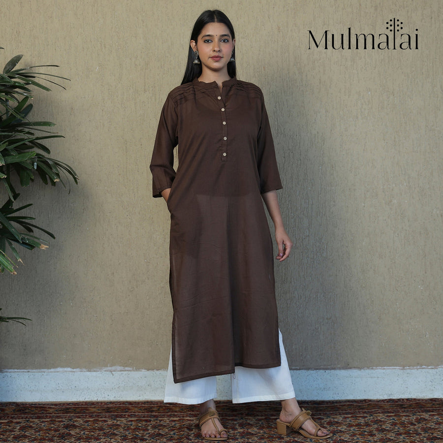 This plain-dyed mulmalai cotton straight kurta is uniquely designed to make you look and feel beautiful. It features a one-side pocket and is made from comfortable mul cotton fabric, ensuring ease and comfort throughout the day. Each piece is meticulously handcrafted by skilled artisans, showcasing their artistry. Mulmalai celebrates the beauty of simplicity, offering a collection that embodies grace, comfort, and effortless style. Embrace the softness and breathability of mul fabric while indulging in the sheer joy of wearing handmade creations.