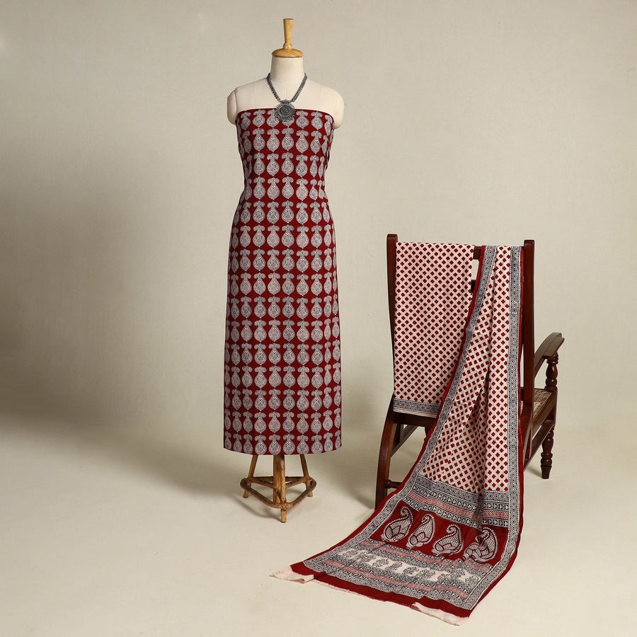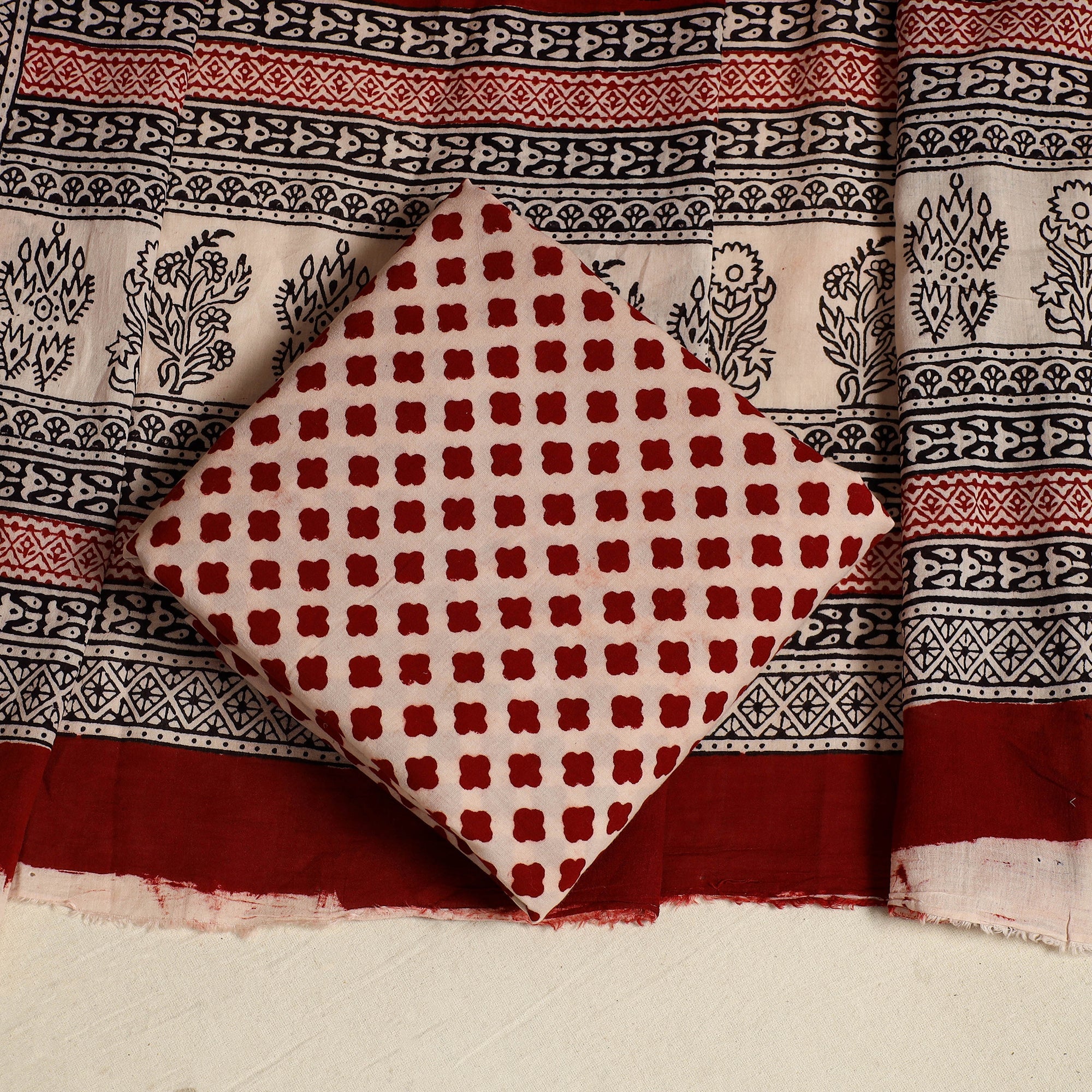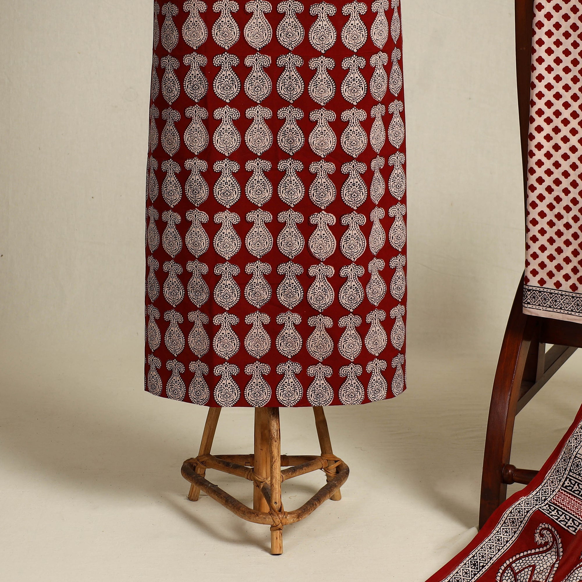 This finest quality red bagh hand block printed cotton 3-piece suit material with cotton dupatta is made using natural dyes through traditional processes by master artisan Umar Faruk Khatri, practiced in Bagh, the Dhar district of Madhya Pradesh. The suit material ensures supreme comfort, making it ideal for all-day wear. The use of natural dyes enhances its eco-friendliness and lends a unique charm to each piece. Embrace the elegance of this ensemble at various occasions, from casual outings to festive gatherings.