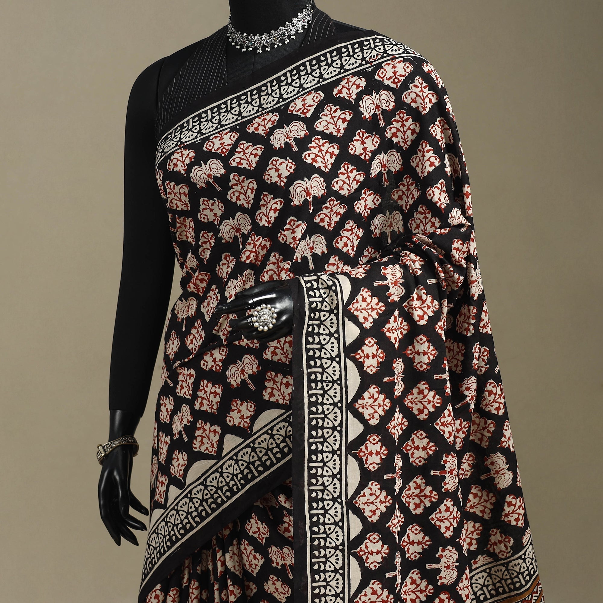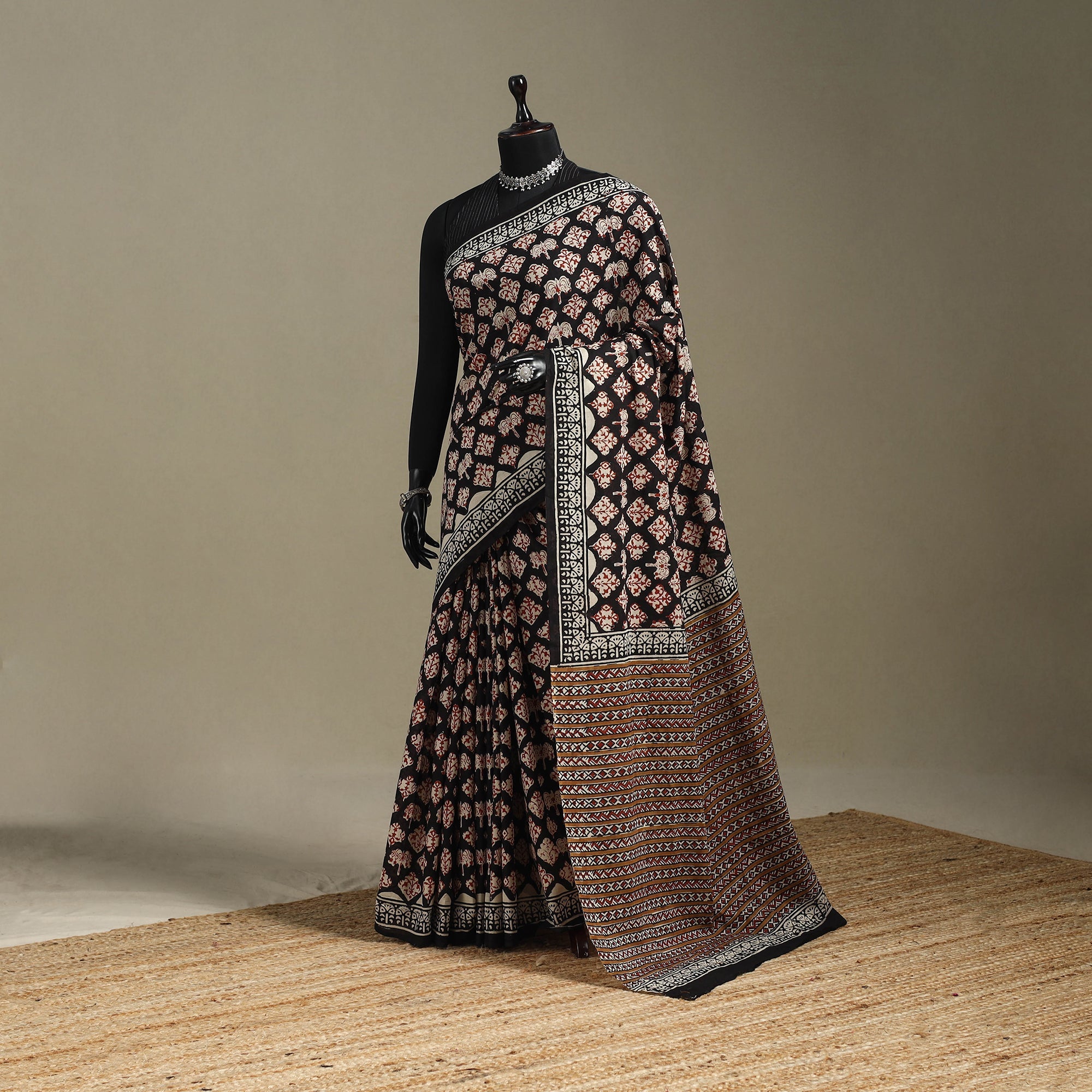 This black bagru hand-block-printed cotton saree showcases the rich heritage of Rajasthan. Made with natural dyes and crafted through the traditional mud resist process, it features intricate designs created using hand-carved wooden blocks. Perfect for every occasion, this saree effortlessly blends tradition with modern style, making it a timeless addition to any wardrobe. Embrace the beauty of Indian craftsmanship with this piece.