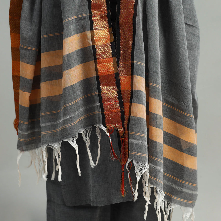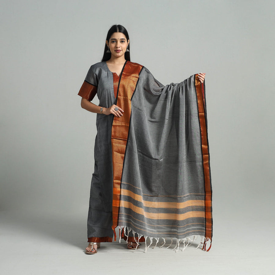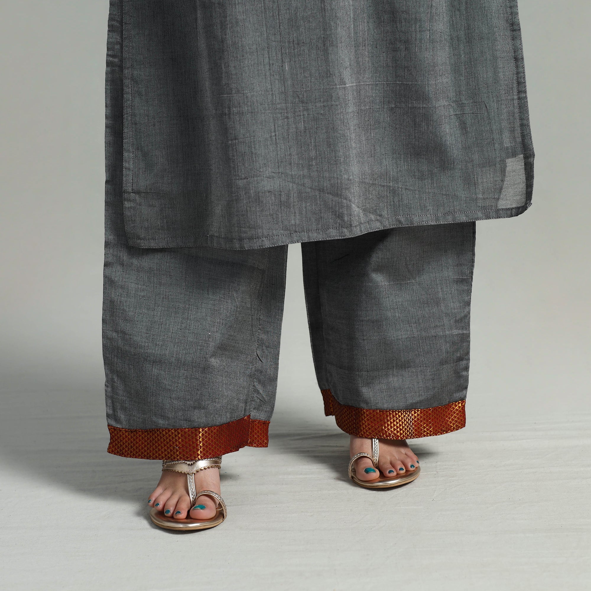 This uniquely designed cotton grey dharwad kurta set with palazzo & dupatta is the perfect blend of comfort and style. This kurta set is crafted from cotton fabric, ensuring a comfortable feel against your skin. The kurta also features a convenient one-side pocket, perfect for carrying small essentials, and the palazzo features an elasticized waist and two side pockets, adding functionality to this palazzo. It boasts an exquisite border, adding a touch of elegance to your ensemble. Perfect for special occasions, this suit set combines fashion and functionality effortlessly, ensuring you look and feel beautiful with ease.