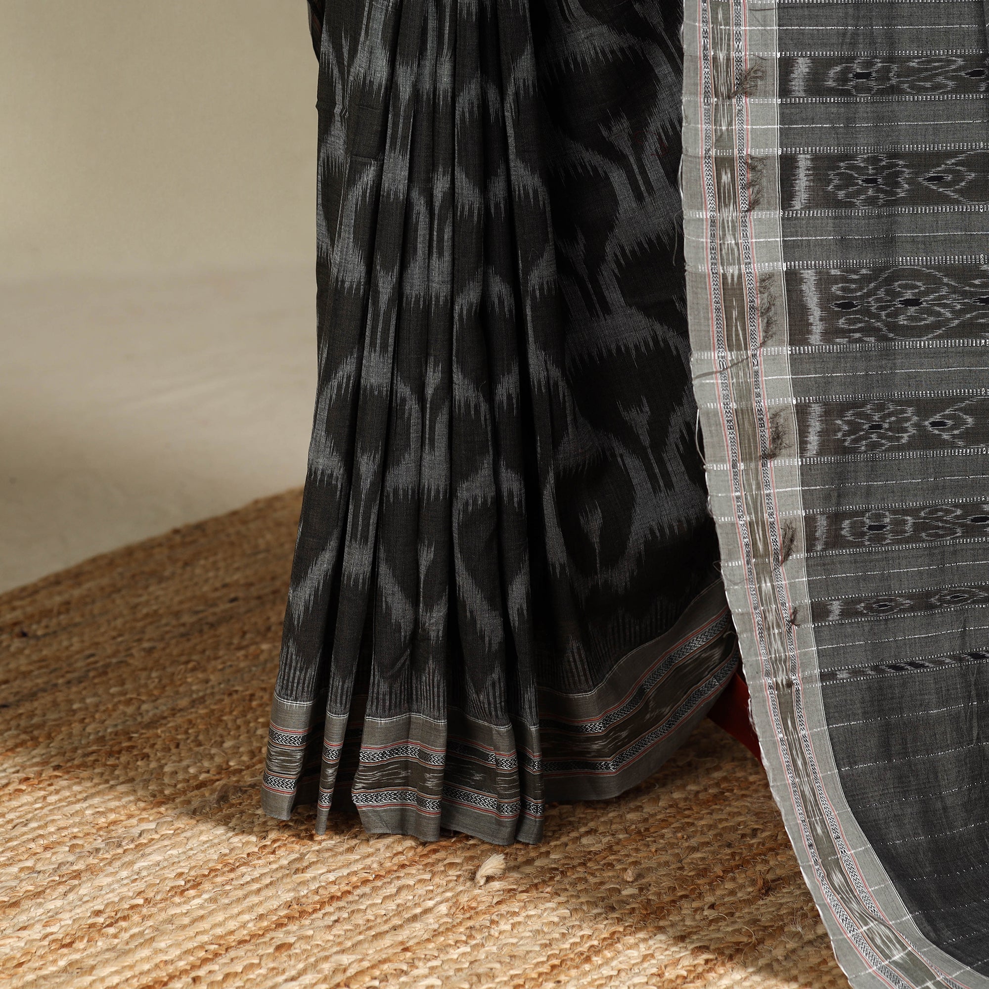 Experience the cultural richness of Odisha with this black sambalpuri Ikat handloom cotton saree, crafted by master artisans from the eastern state of Odisha. This exquisite saree showcases traditional motifs such as shankha (shell), chakra (wheel), and phula (flower), adding a touch of elegance to any occasion. The intricate ikat dyeing technique produces mesmerizing patterns, textures, and colors that are renowned worldwide. Indian Ikat is always admired by fashion designers around the world.