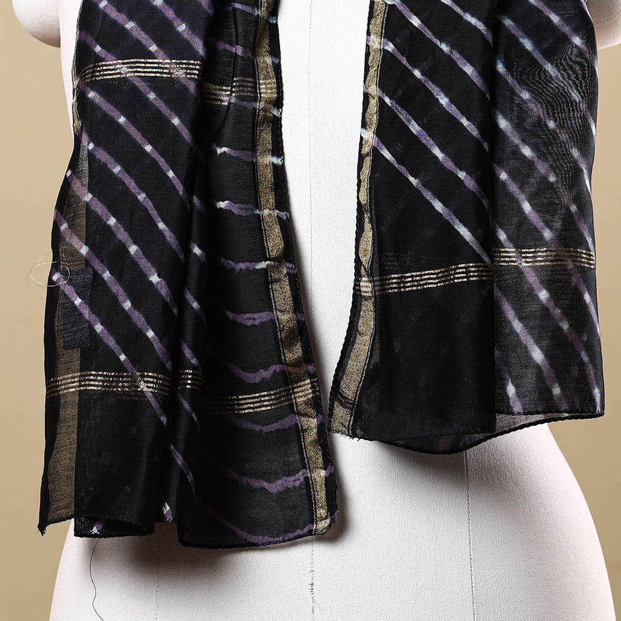 The exquisite craftsmanship of this fine quality leheriya tie-dye mothra chanderi silk cotton handloom stole with a zari border. The beautiful wavy patterns on this stole were created using the traditional leheriya tie-dye technique by the master artisan family of Badshah Miyan in Rajasthan. Made with azo-free dyes. The blend of chanderi silk and cotton gives it a gossamer look and a luxurious feel. Complete with a zari border, this stole is the perfect accessory to elevate your outfit and add a touch of elegance to any occasion.