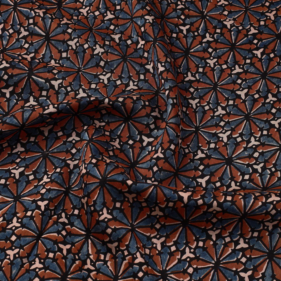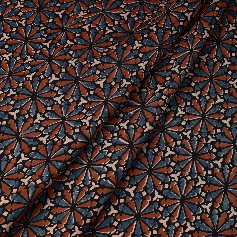 Fine-quality multicolor ajrakh block-printed natural dyed handloom chanderi silk fabric, made using natural dyes through the traditional ajrakh technique of hand block printing by Sufiyan Khatri, practiced in the Kutch region of Gujarat. Chanderi silk is renowned for its sheer texture, lightweight feel, and intricate designs. Perfect for creating stunning ethnic wear, sarees, dupattas, and elegant outfits. Embrace the rich heritage of Indian textile artistry with this exquisite fabric.