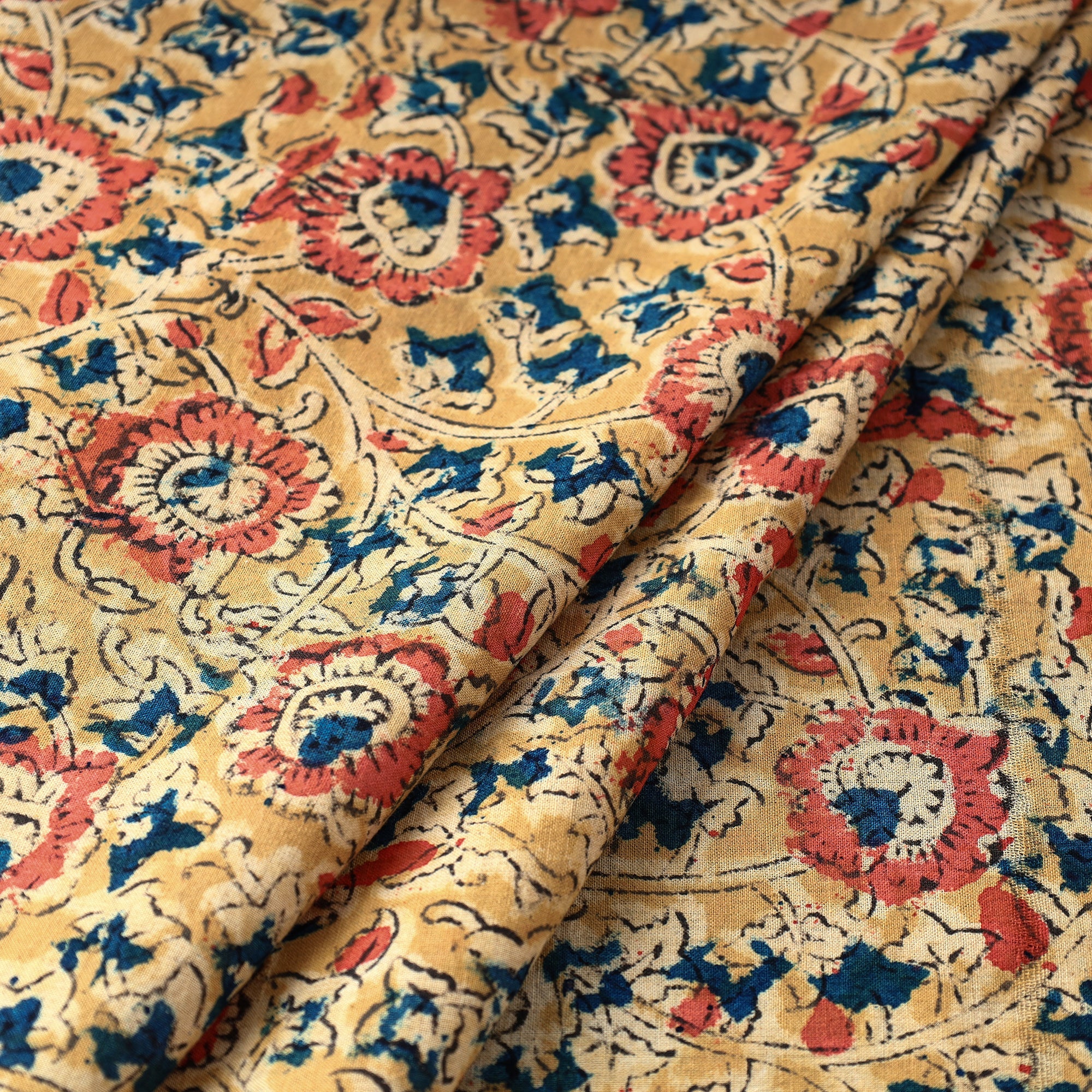 Indulge in the rich artistry of kalamkari with this fine-quality cotton fabric. Hand-block printed using natural dyes, this fabric showcases an array of traditional motifs inspired by Kalamkari painting. The intricate detailing and complex techniques used by artisans from Andhra Pradesh make this fabric a masterpiece. Perfect for creating stunning apparel, home decor, or accessories with a touch of traditional elegance. Elevate your style with this exquisite Kalamkari block-printed cotton fabric.