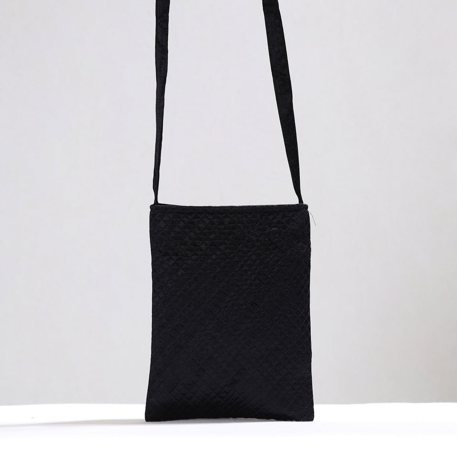 This black neran hand embroidery mirror work mashru silk sling bag showcases the traditional craftsmanship of the Kutch region of Gujarat. This bag is made of mashru silk fabric with hand-embroidered mirror work that adds a touch of elegance and exclusivity to its design. It has a cotton fabric lining inside and an inside pocket with a zip main closure. Provides ample space to keep your essential items. This bag is functional also a reflection of the rich cultural heritage and craftsmanship of the Kutch region, making it a perfect accessory for those who appreciate traditional art and style.