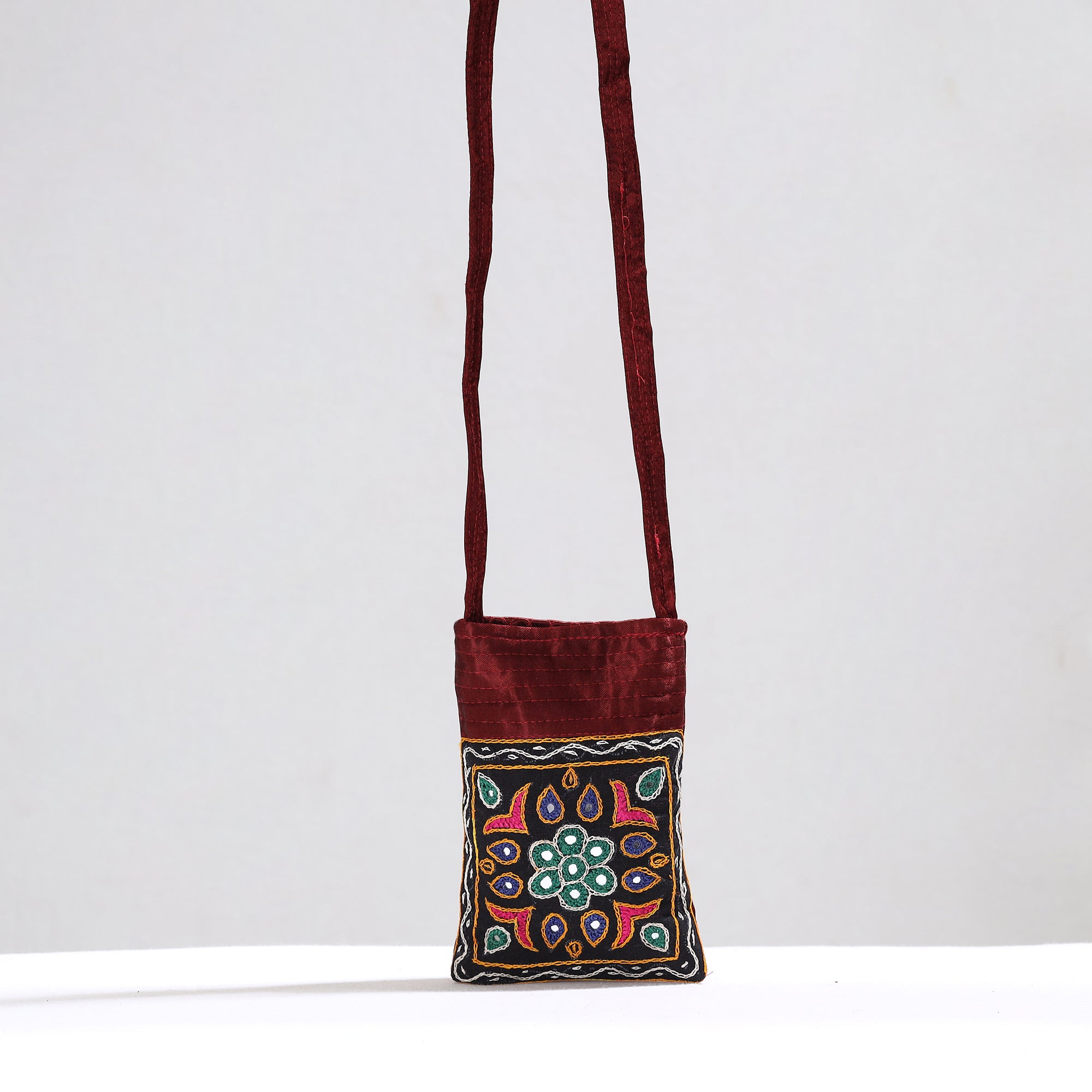 This maroon pakko hand embroidery mirror work mashru silk sling bag showcases the traditional craftsmanship of the kutch region of Gujarat. This bag is made of mashru silk fabric with hand-embroidered mirror work that adds a touch of elegance and exclusivity to its design. It has a cotton fabric lining inside and with zip main closure. This bag is functional also a reflection of the rich cultural heritage and craftsmanship of the Kutch region, making it a perfect accessory for those who appreciate traditional art and style.