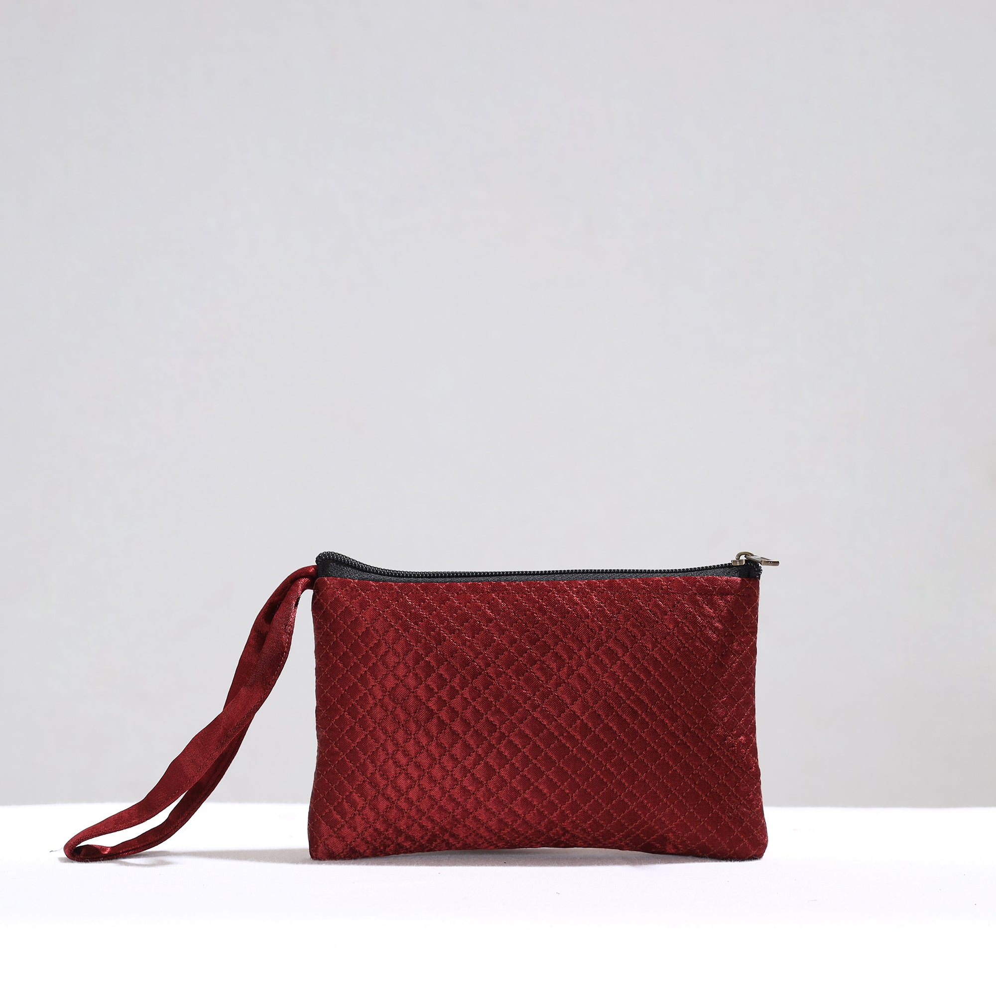 This maroon exquisite Pakko hand embroidery mirror work mashru silk mobile pouch is a wonderful piece of art, showcasing the traditional craftsmanship of the Kutch region of Gujarat. Crafted from sumptuous mashru silk, this pouch seamlessly blends heritage with contemporary elegance. It has a cotton fabric lining and a zip main closure. The pouch is designed with a convenient handle, making it easy to carry and secure your mobile device.