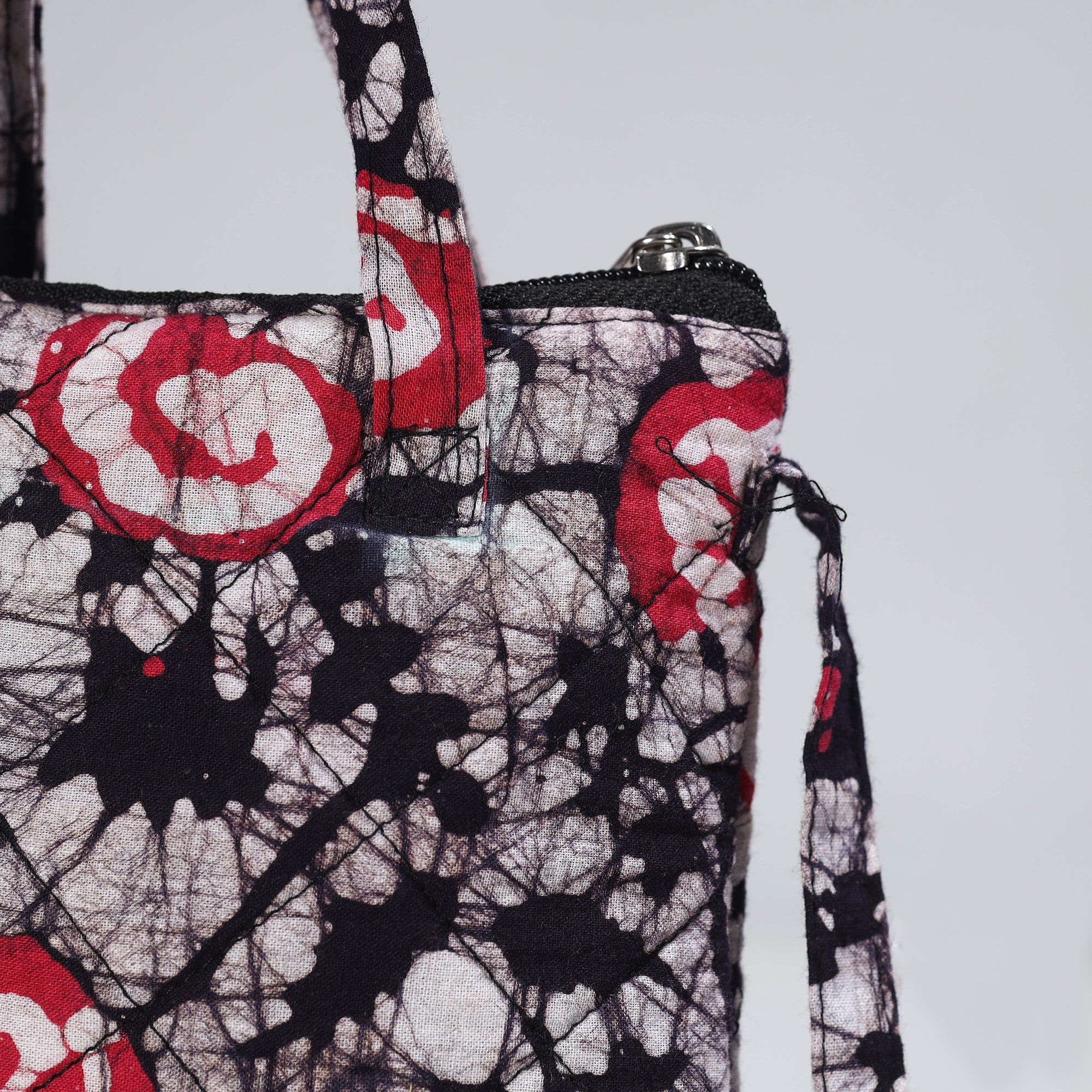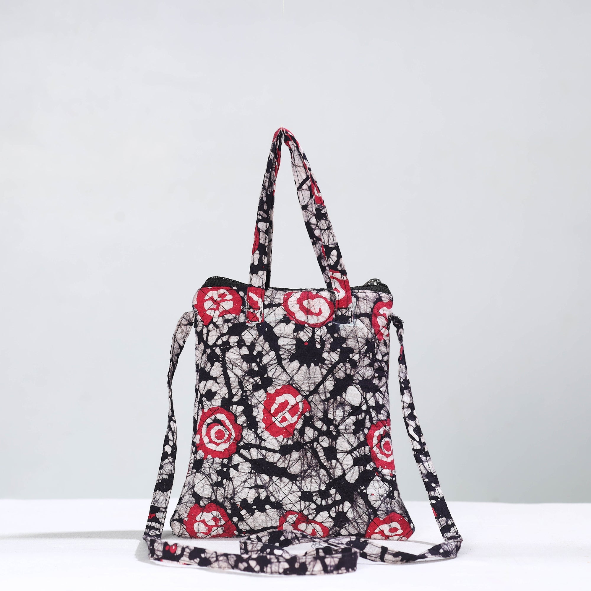 This black sling bag is made from hand-batik-printed quilted cotton fabric. This sling bag boasts convenient pockets with a zip-lock main closure, providing ample space for your essentials. The foam layer lining ensures durability and protection. Enhance your style with this unique, functional accessory.