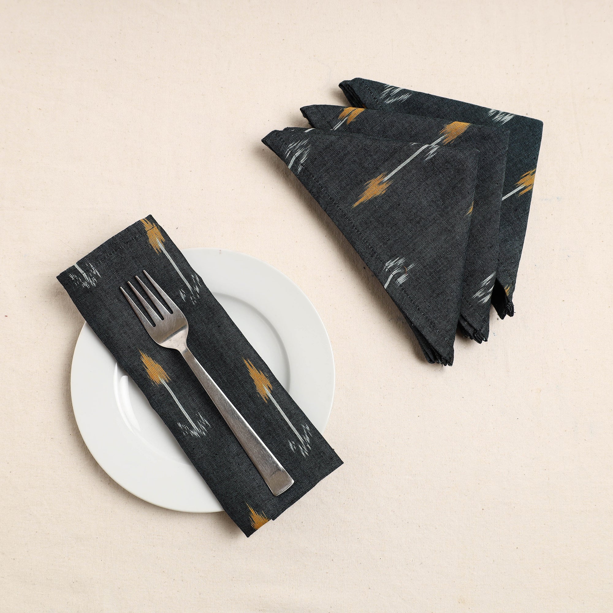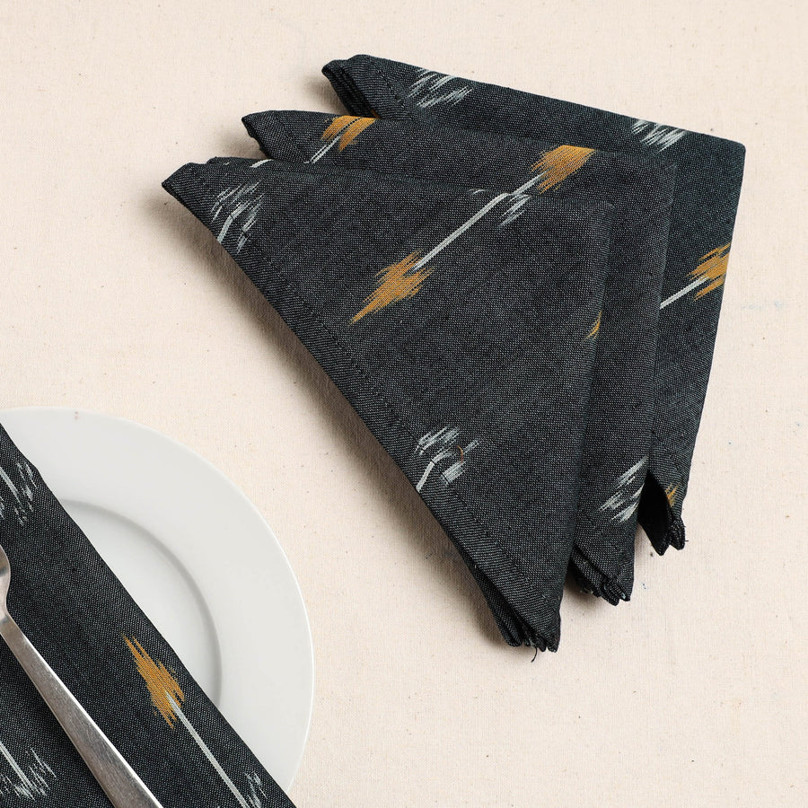 Elevate your dining experience with our grey pochampally ikat weave cotton table napkins. This fabric showcases the artistry of the ikat dyeing technique, where intricate patterns are created through a resist dyeing process. These napkins add a touch of traditional charm to any table setting. Perfect for both casual and formal occasions, they effortlessly combine style and functionality, making every meal a delightful affair.