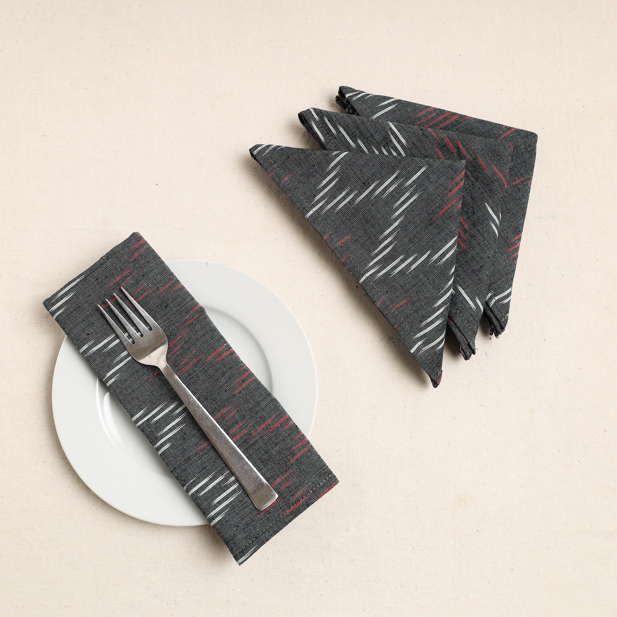 Elevate your dining experience with our grey pochampally ikat weave cotton table napkins. This fabric showcases the artistry of the ikat dyeing technique, where intricate patterns are created through a resist dyeing process. These napkins add a touch of traditional charm to any table setting. Perfect for both casual and formal occasions, they effortlessly combine style and functionality, making every meal a delightful affair.