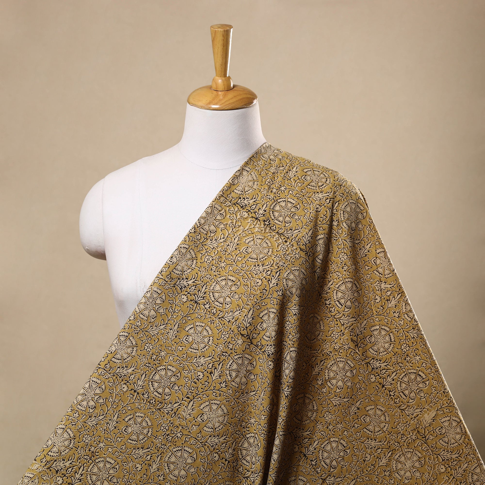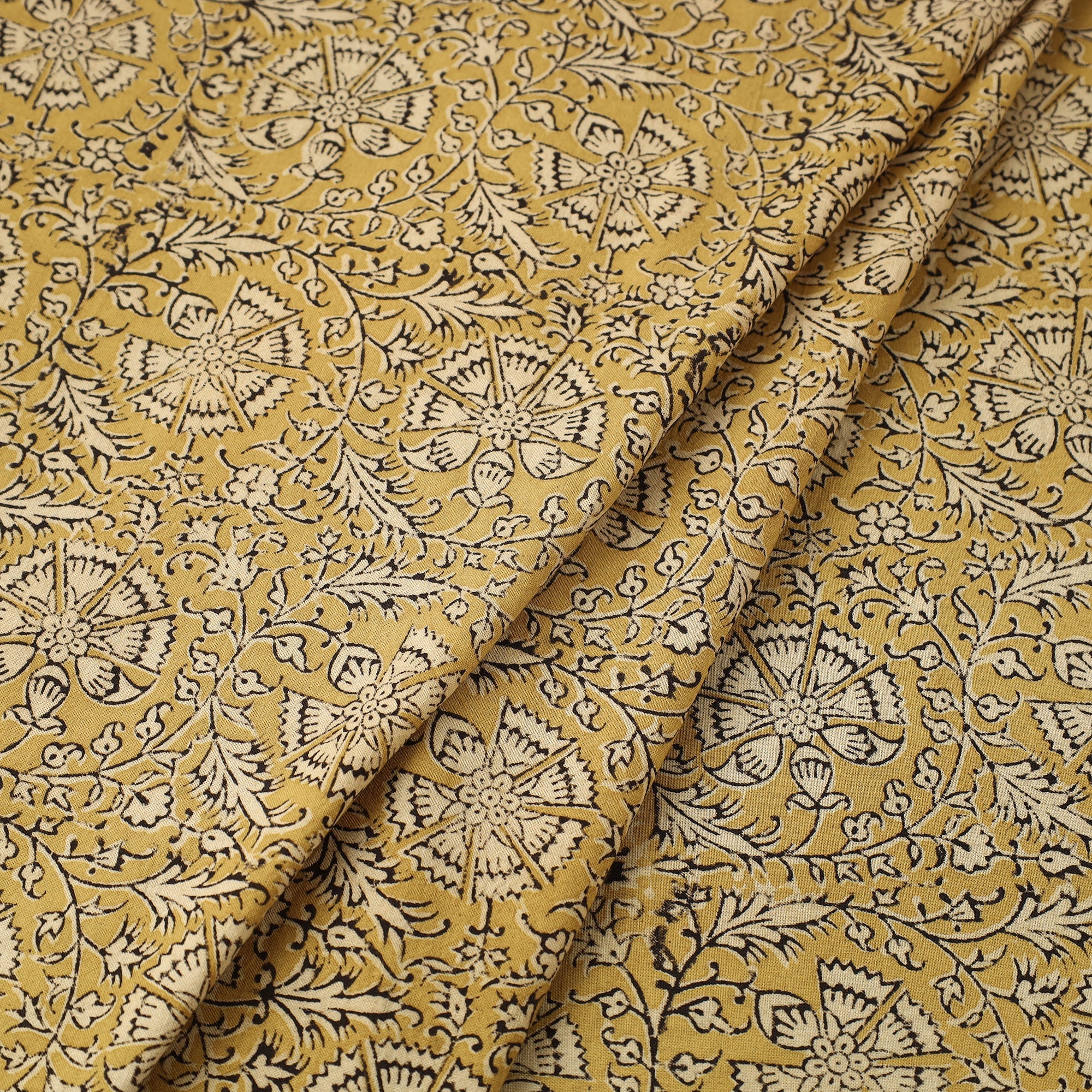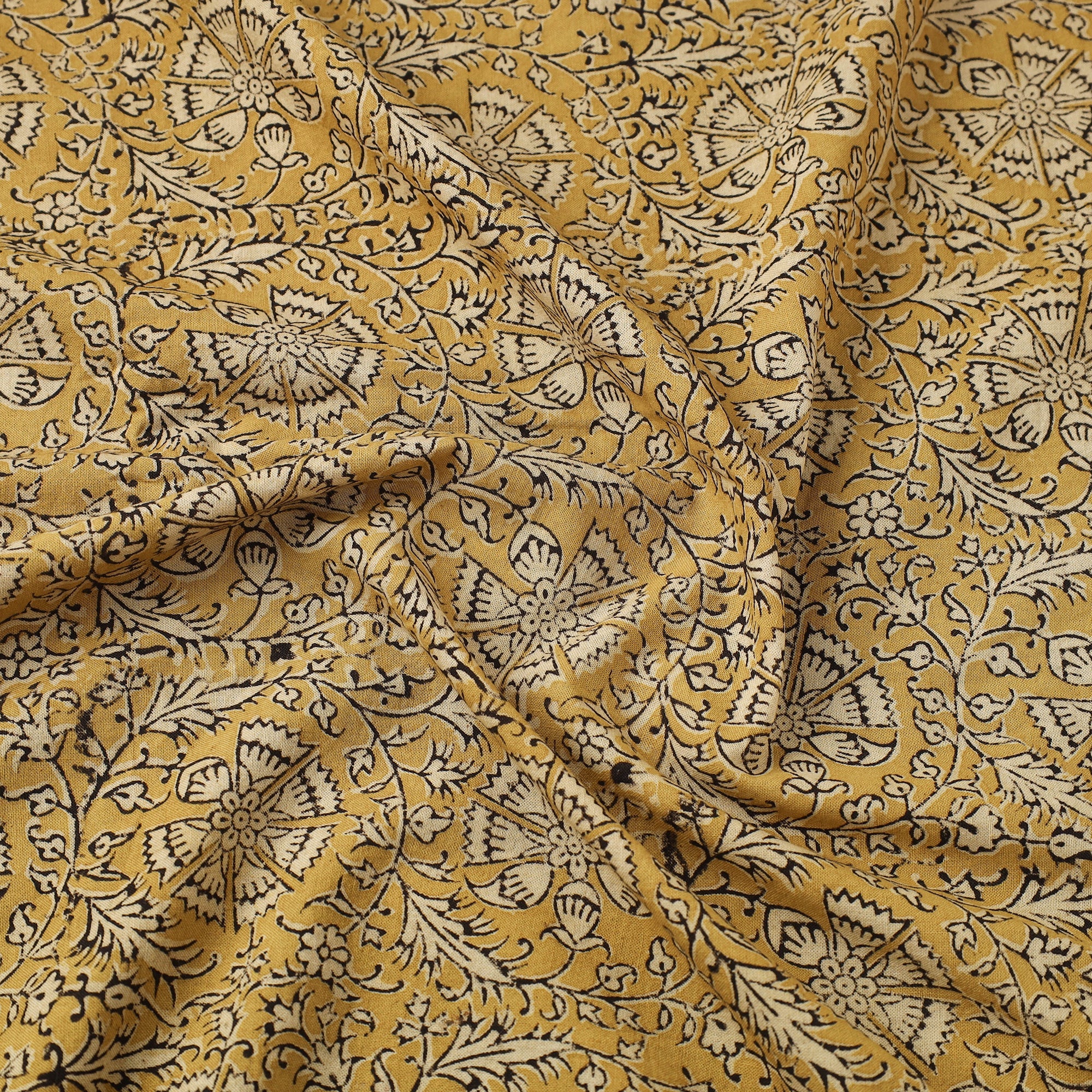 This yellow pure cotton fabric is skillfully crafted by the artisans of pedana using traditional kalamkari block printing techniques. It showcases an assortment of hand-printed motifs inspired by the traditional kalamkari painting. The fabric is naturally dyed and of fine quality. Kalamkari is one of the earliest and most complex techniques of block-printing.