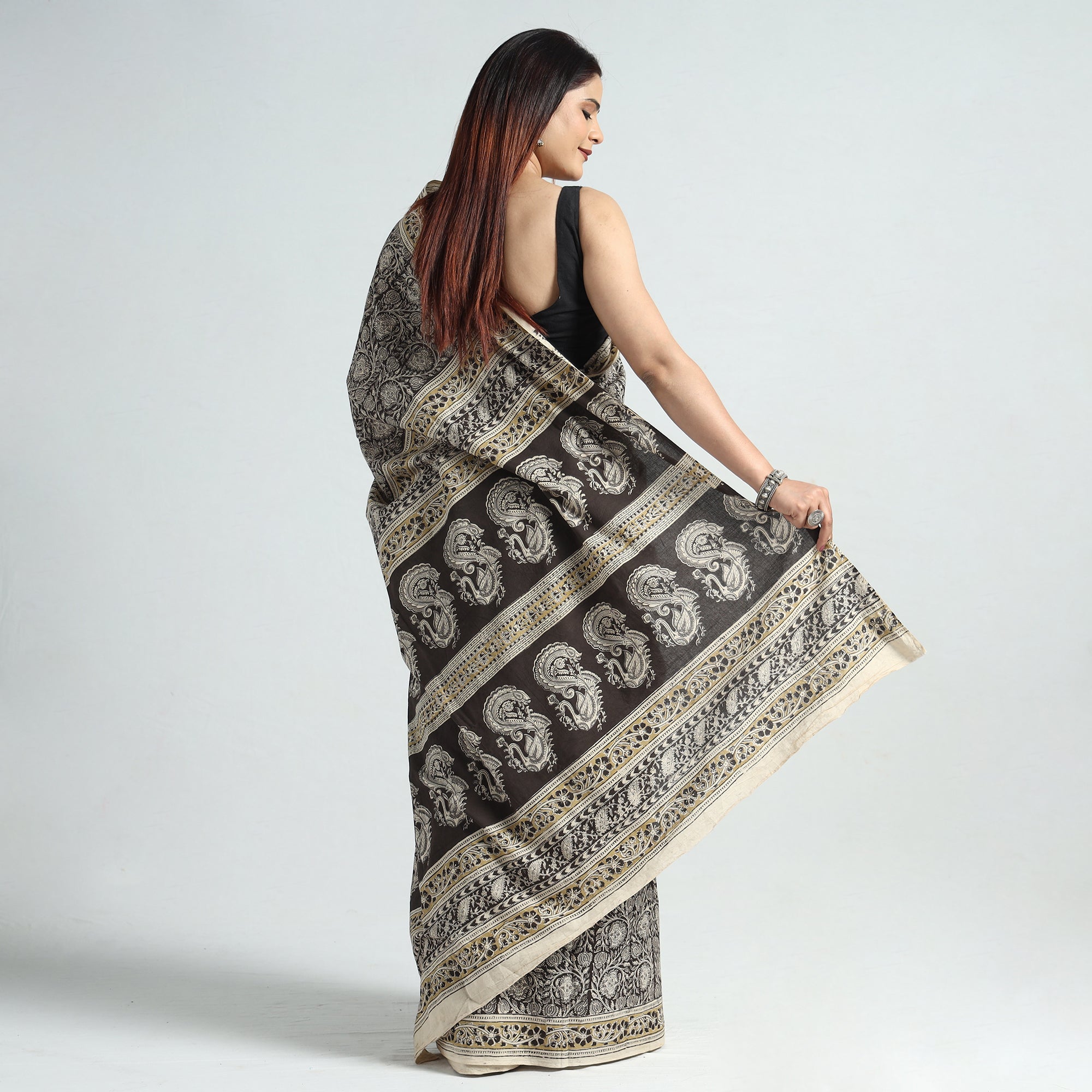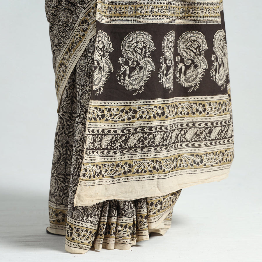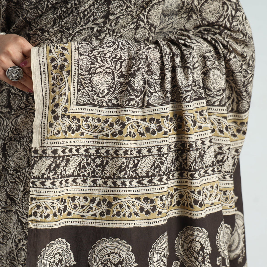 Fine-quality grey Kalamkari saree with block-printed . This kalamkari cotton saree features intricate designs and natural dyes, reflecting the rich tradition of Kalamkari art. Perfect for special occasions, it combines elegance with comfort. Celebrate Indian craftsmanship and support local artisans with this unique piece.
