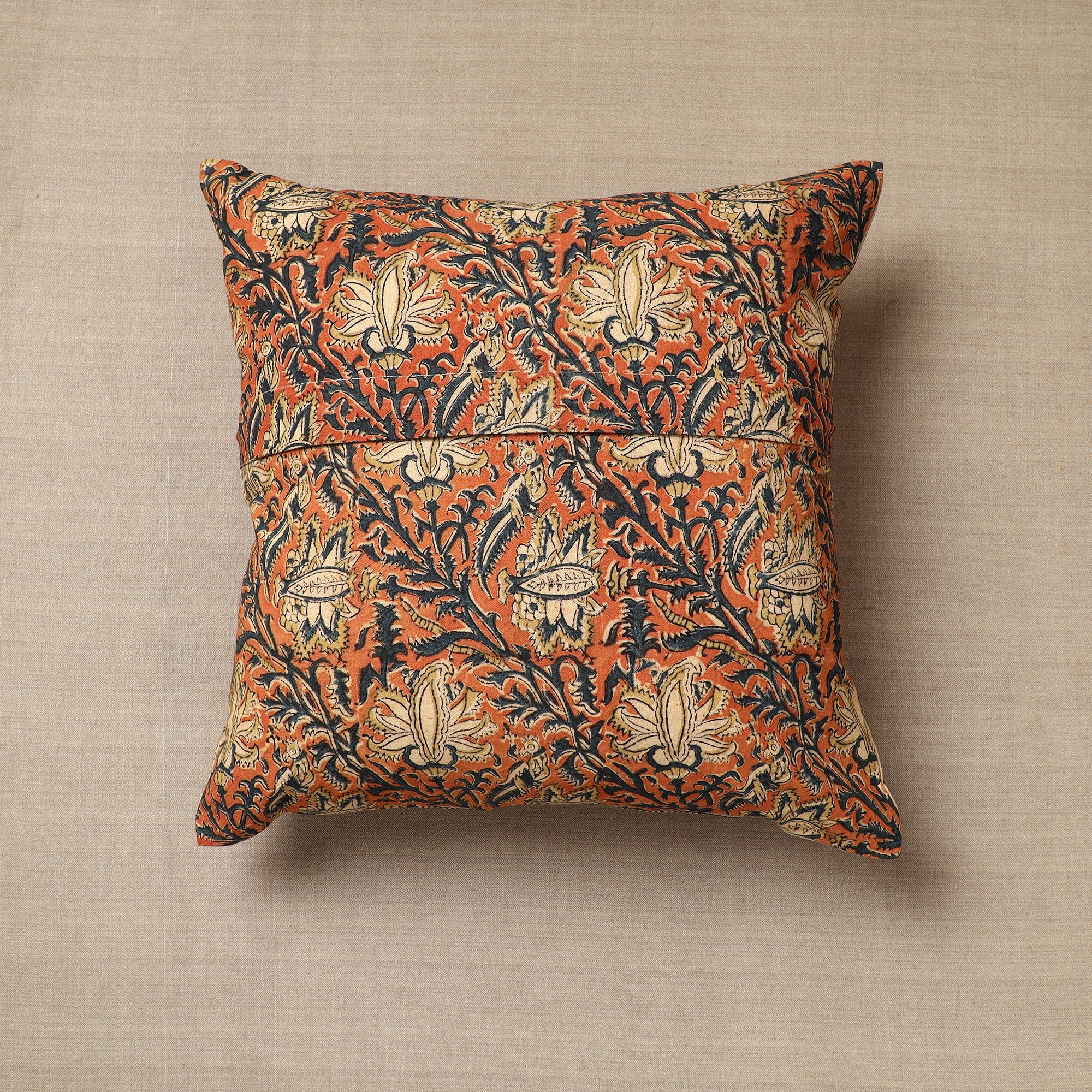 Beautiful orange cushion cover made of fine quality cotton fabric that has been skillfully block printed by the artisans of Pedana using the traditional technique of kalamkari. The cover features an assortment of hand-block-printed motifs that are inspired by the traditional kalamkari paintings. Kalamkari is one of the oldest and most complex techniques of block printing, and this cushion cover is a great example of the exquisite craftsmanship that goes into creating such works of art. It will make a wonderful addition to any home decor, adding a touch of traditional elegance and charm.