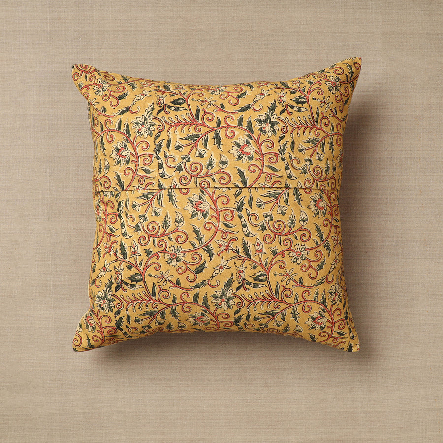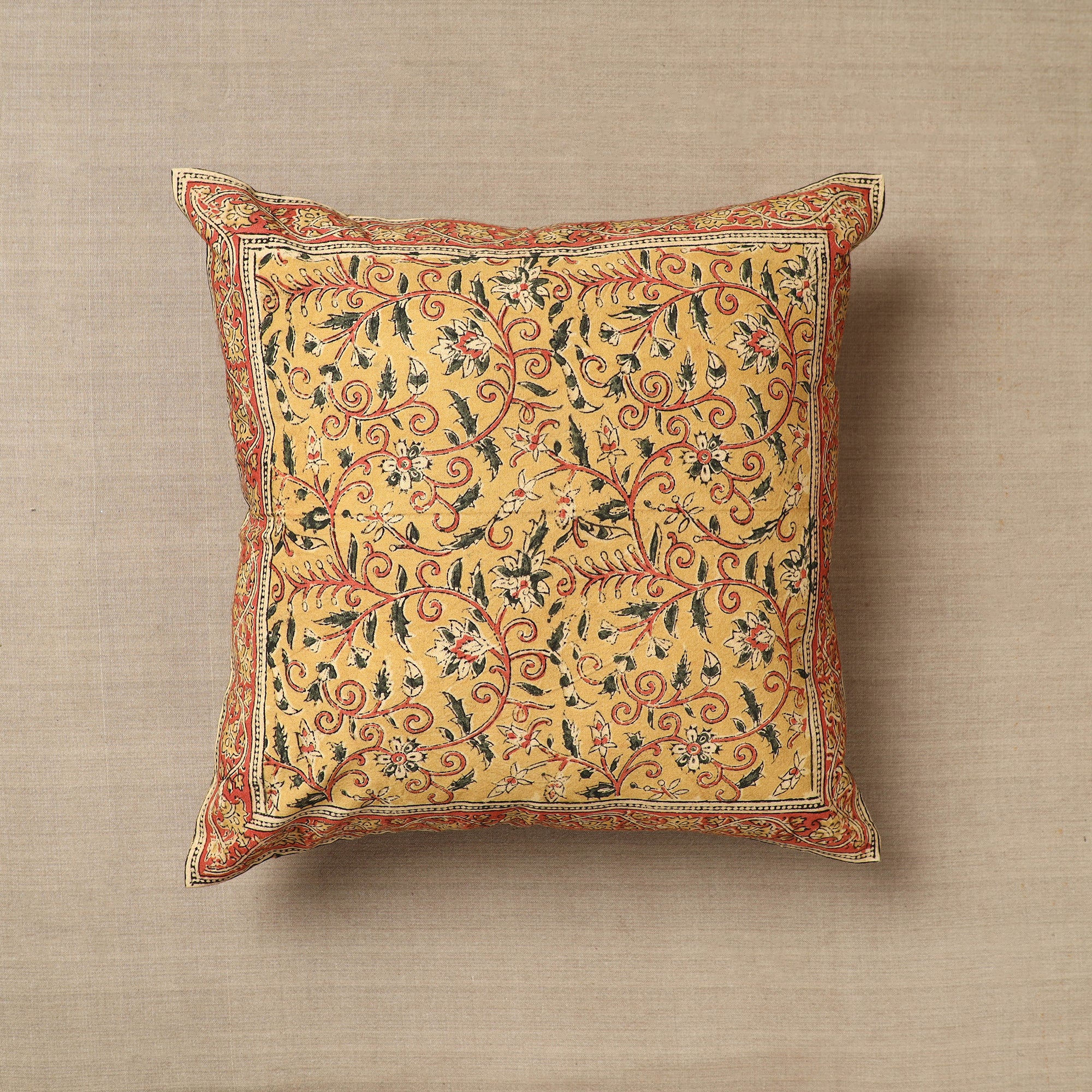 Beautiful cushion cover made of fine quality yellow cotton fabric that has been skillfully block printed by the artisans of Pedana using the traditional technique of kalamkari. The cover features an assortment of hand-block-printed motifs that are inspired by the traditional kalamkari paintings. Kalamkari is one of the oldest and most complex techniques of block printing, and this cushion cover is a great example of the exquisite craftsmanship that goes into creating such works of art. It will make a wonderful addition to any home decor, adding a touch of traditional elegance and charm.
