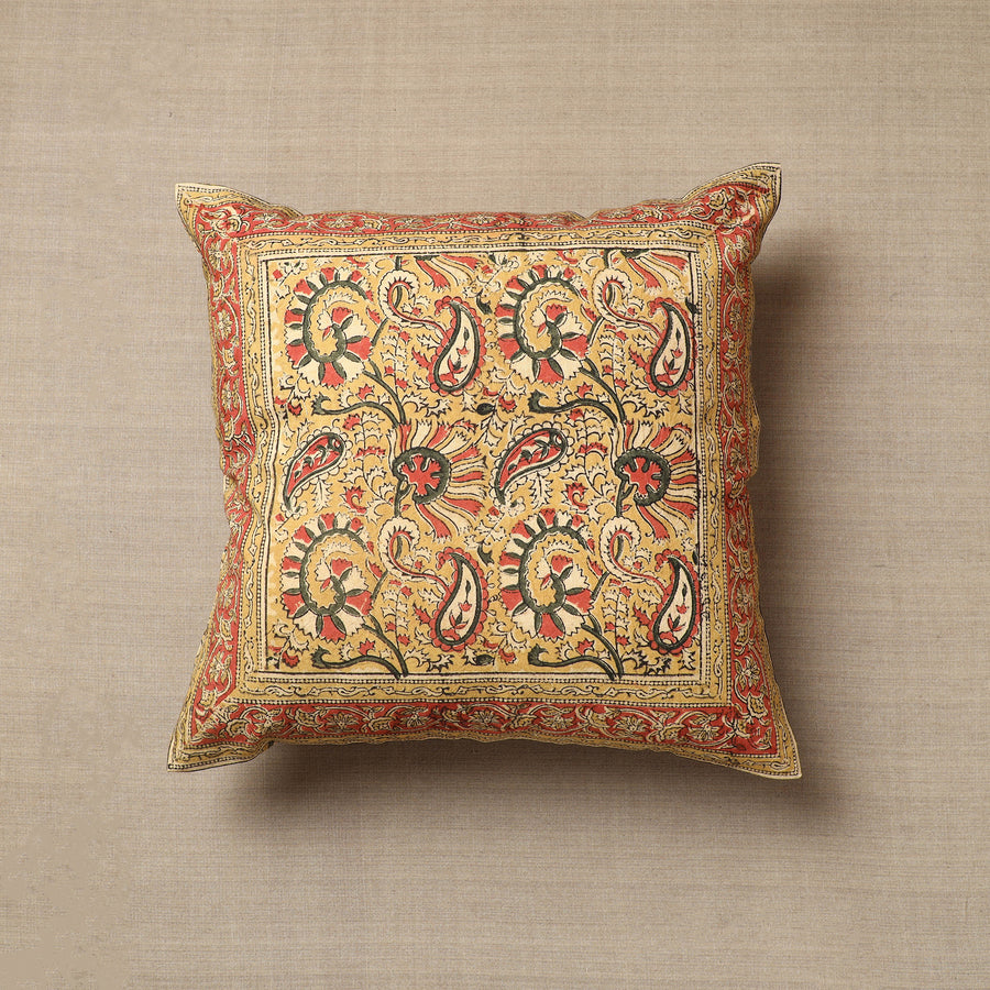 Beautiful yellow cushion cover made of fine quality cotton fabric that has been skillfully block printed by the artisans of Pedana using the traditional technique of kalamkari. The cover features an assortment of hand-block-printed motifs that are inspired by the traditional kalamkari paintings. Kalamkari is one of the oldest and most complex techniques of block printing, and this cushion cover is a great example of the exquisite craftsmanship that goes into creating such works of art. It will make a wonderful addition to any home decor, adding a touch of traditional elegance and charm.