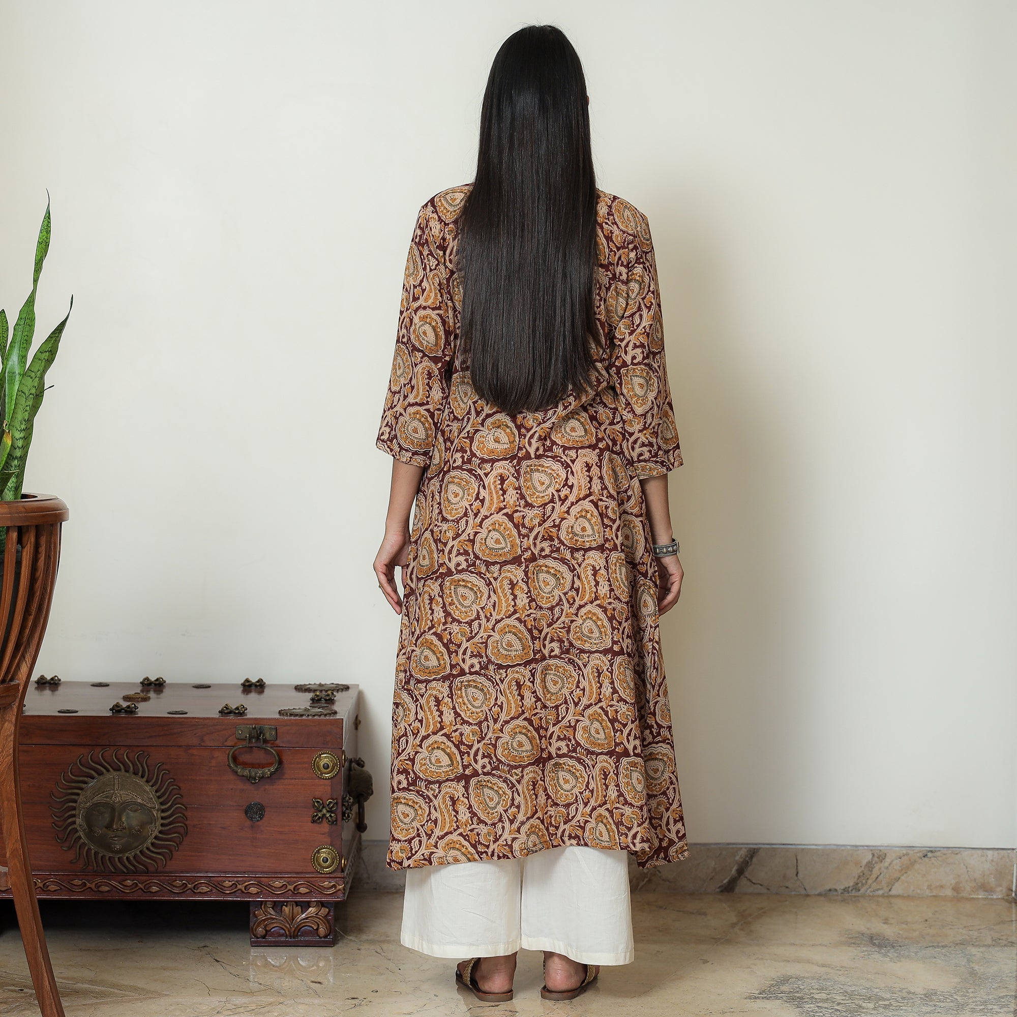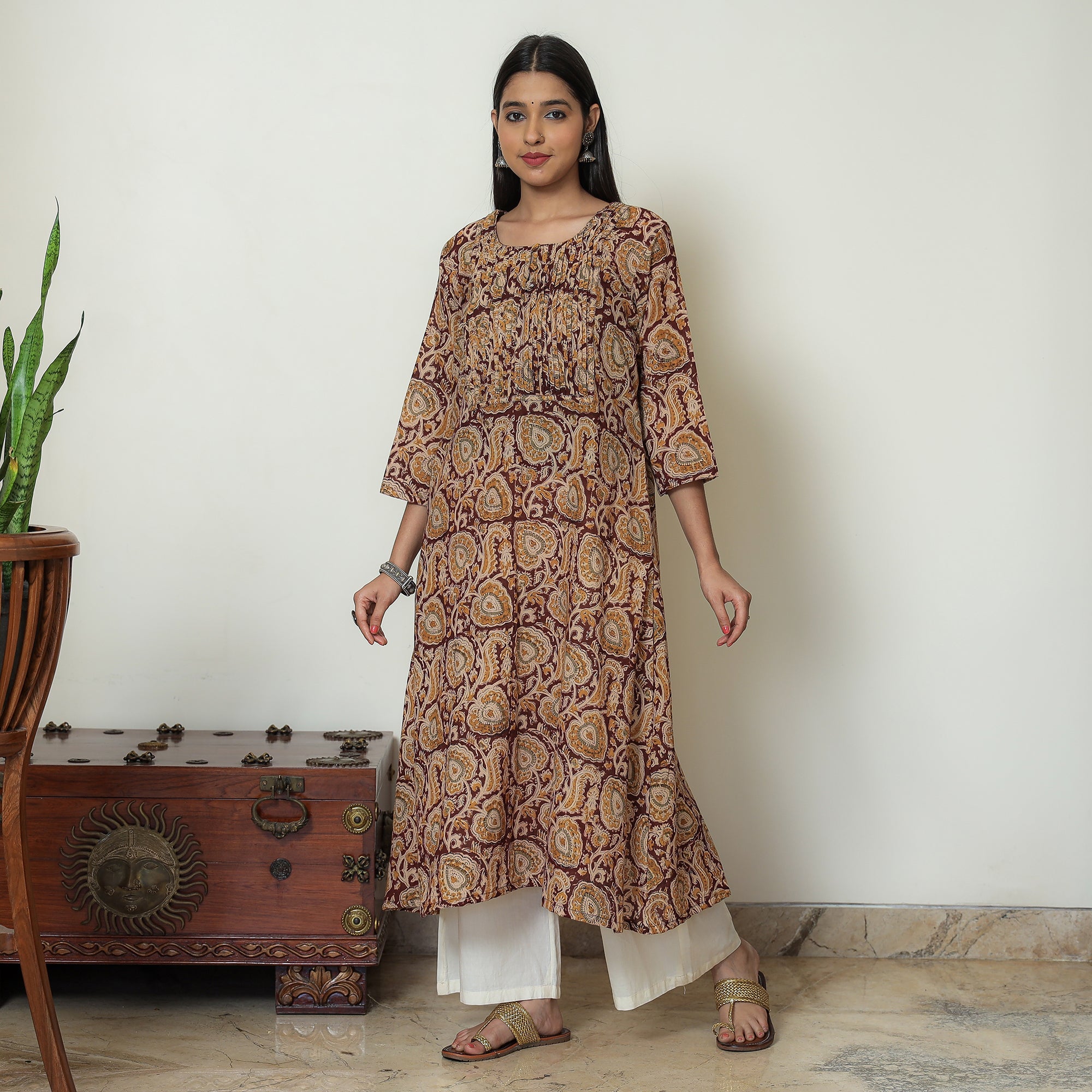 This uniquely designed hand-block-printed mul cotton a-line kalamkari kurta is a perfect blend of style and comfort. This kurta is crafted from natural-dyed cotton fabric, ensuring a comfortable feel against your skin. It boasts an exquisite pintuck design, adding a touch of elegance to your ensemble. This kurta features intricate patterns created by hand-carved wooden blocks and a convenient one-side pocket, perfect for carrying small essentials. This cotton kurta makes you comfortable all day long. This kurta is perfect for your daily outing and for a special occasion.