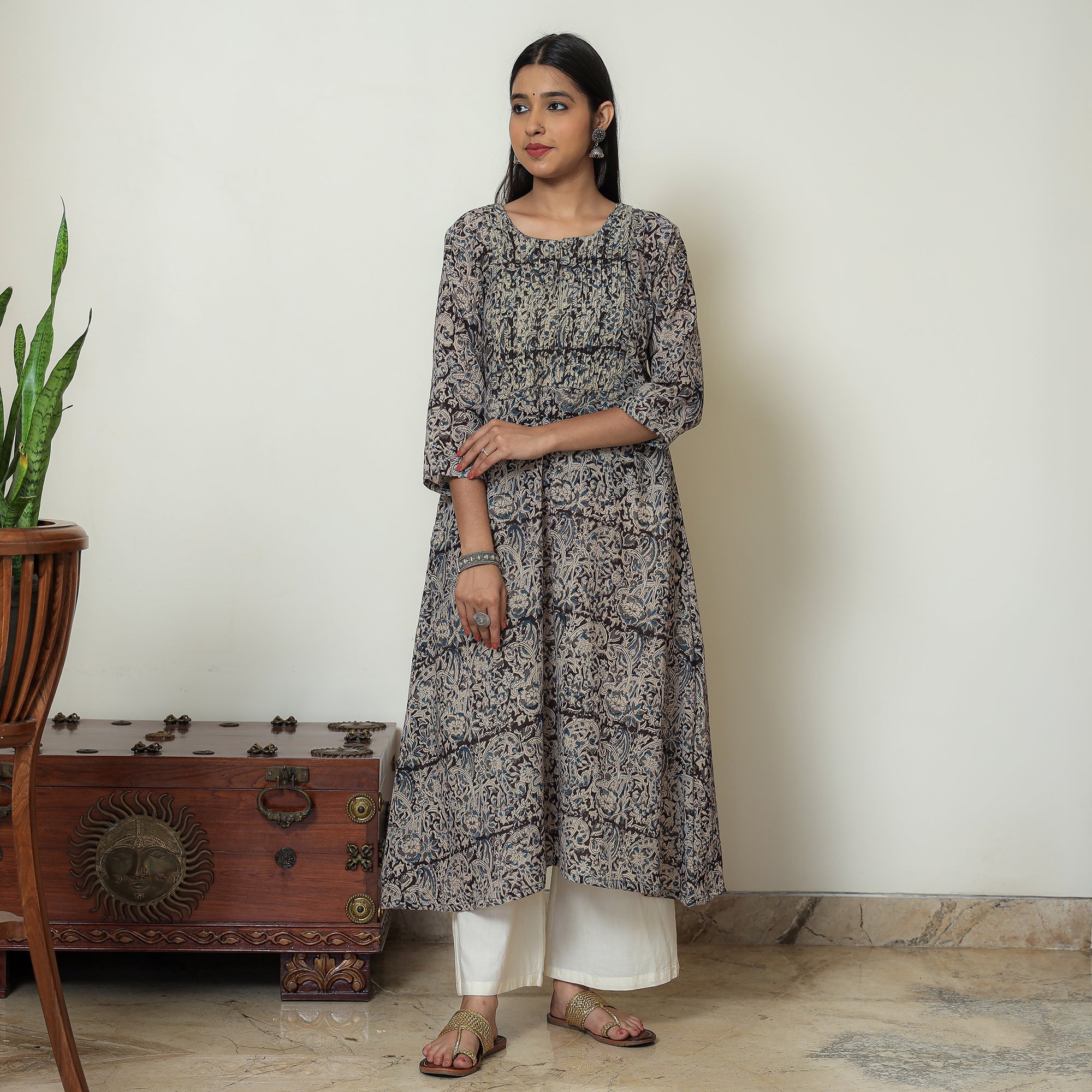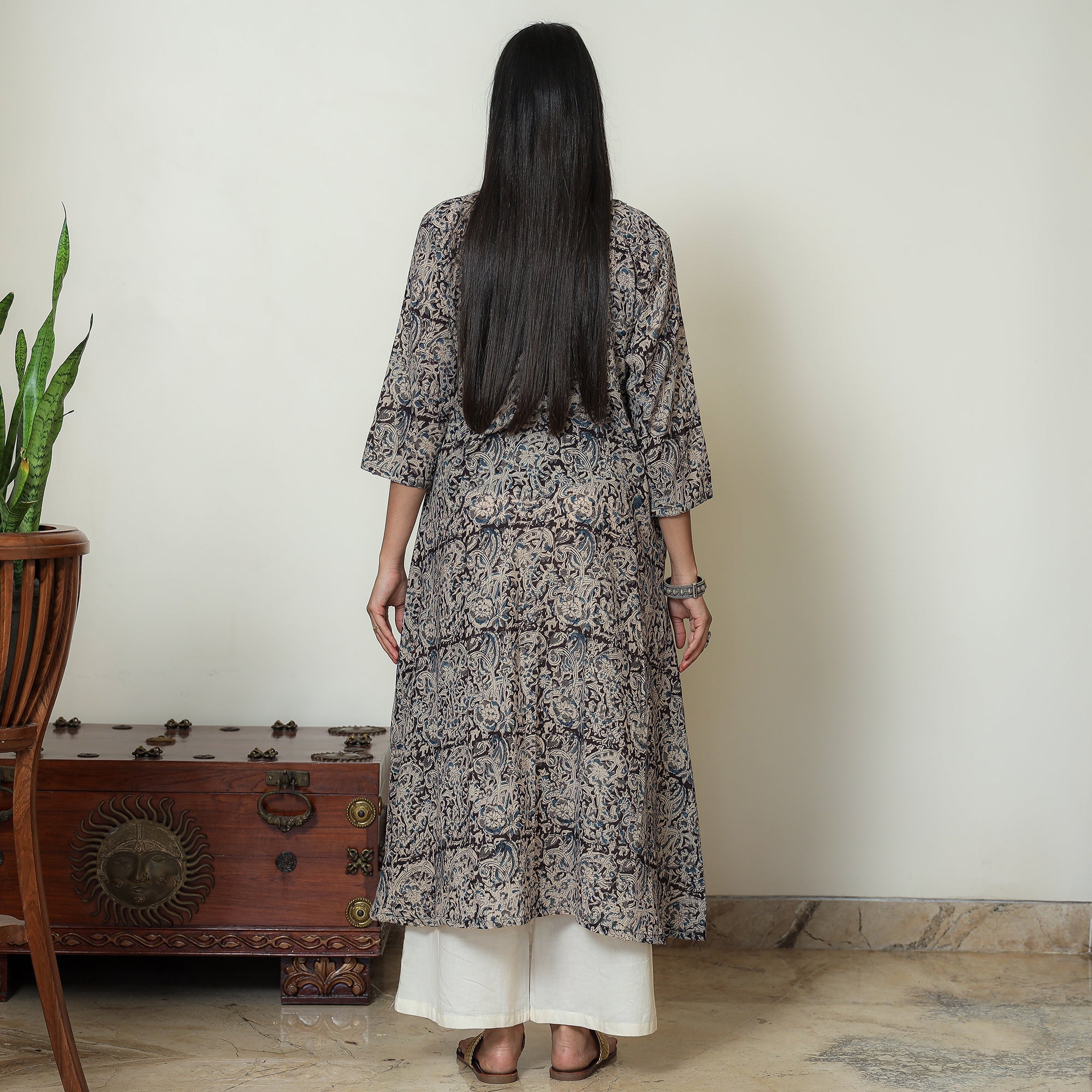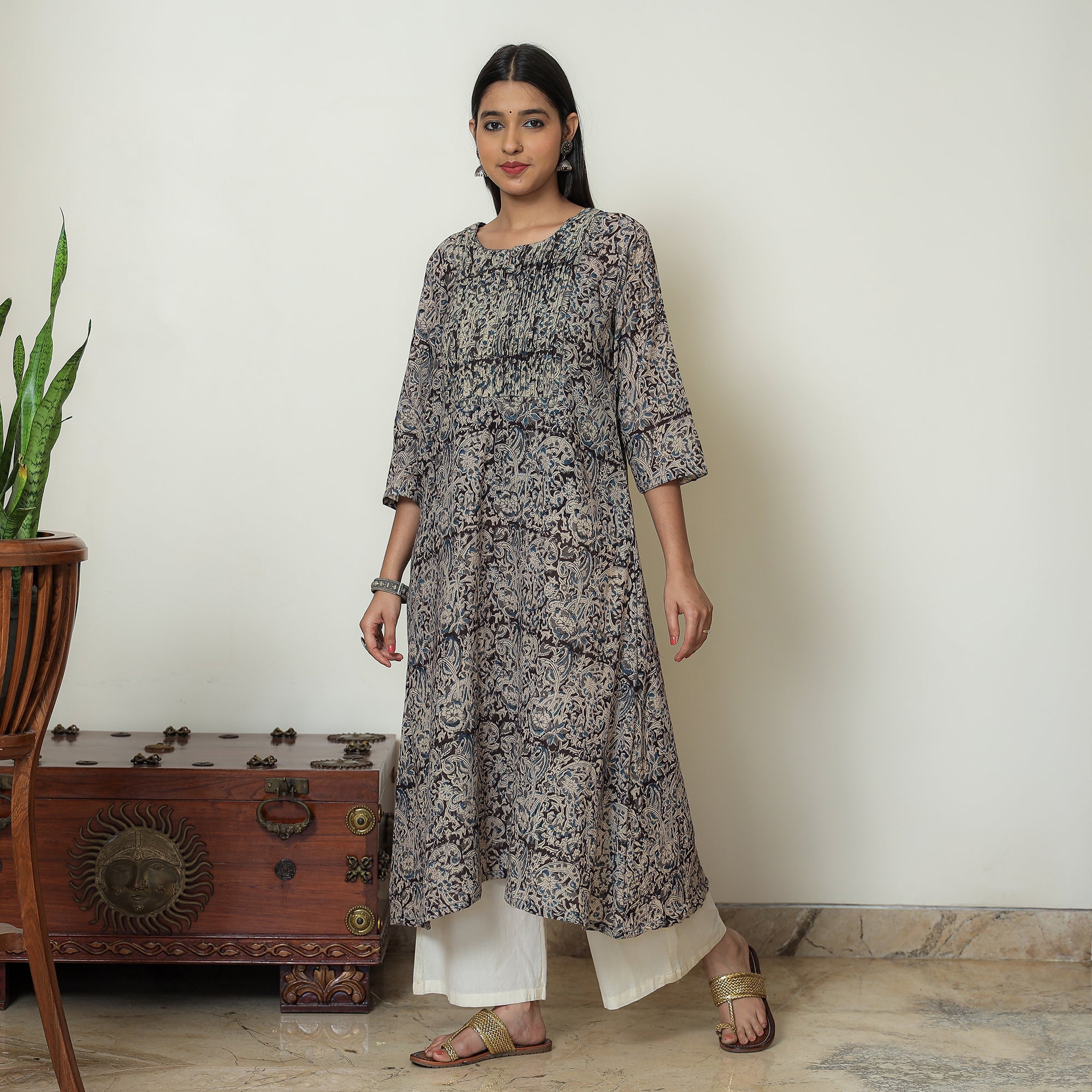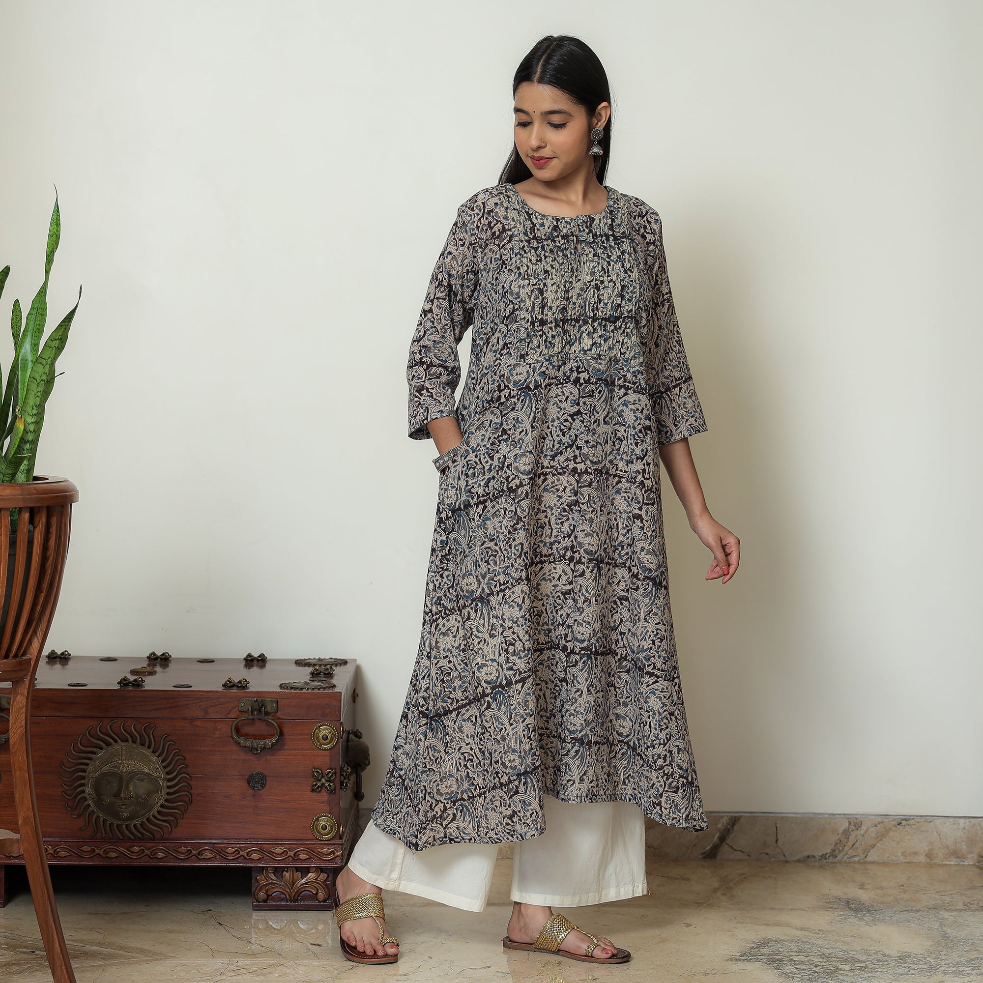 This uniquely designed hand-block-printed mul cotton a-line kalamkari kurta is a perfect blend of style and comfort. This kurta is crafted from natural-dyed cotton fabric, ensuring a comfortable feel against your skin. It boasts an exquisite pintuck design, adding a touch of elegance to your ensemble. This kurta features intricate patterns created by hand-carved wooden blocks and a convenient one-side pocket, perfect for carrying small essentials. This cotton kurta makes you comfortable all day long. This kurta is perfect for your daily outing and for a special occasion.