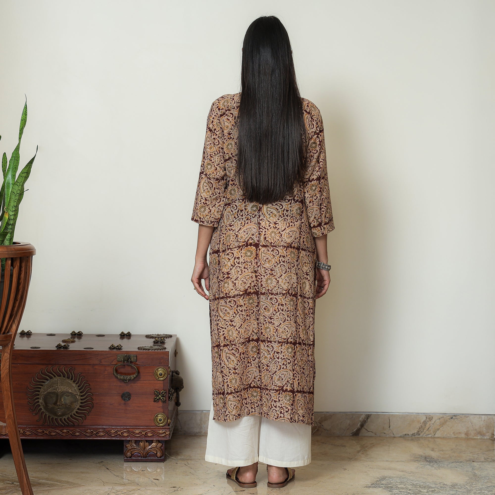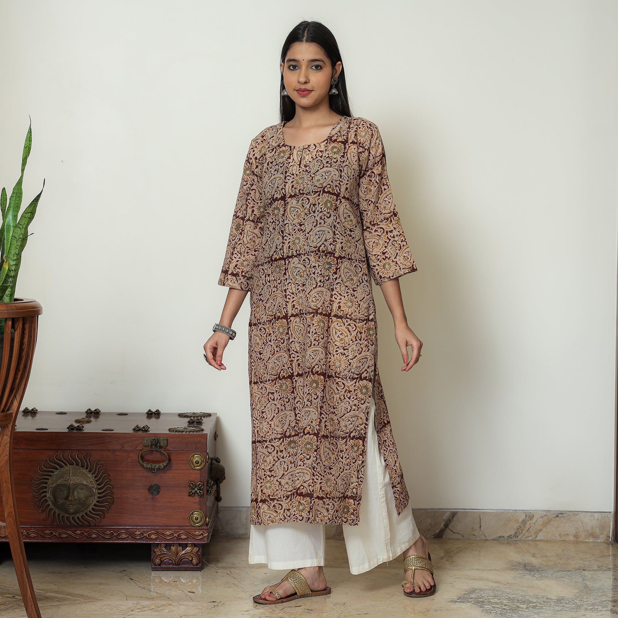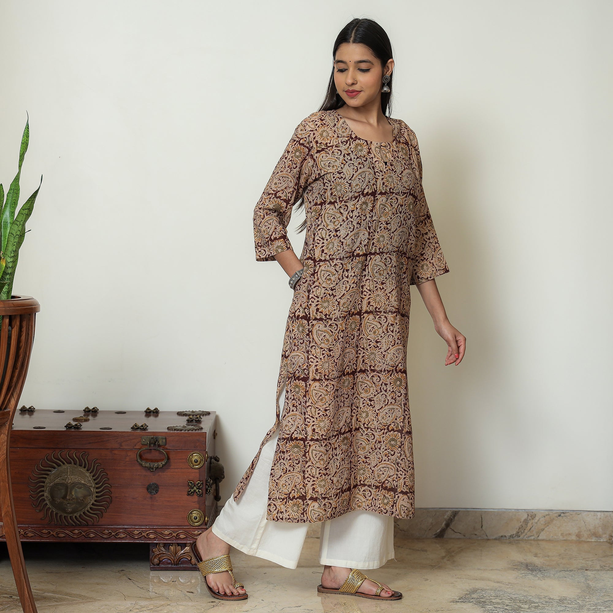 This uniquely designed hand-block-printed mul cotton straight kalamkari kurta is a perfect blend of style and comfort. This kurta is crafted from natural-dyed cotton fabric, ensuring a comfortable feel against your skin.This kurta features intricate patterns created by hand-carved wooden blocks and a convenient one-side pocket, perfect for carrying small essentials. This cotton kurta makes you comfortable all day long. This kurta is perfect for your daily outing and for a special occasion.