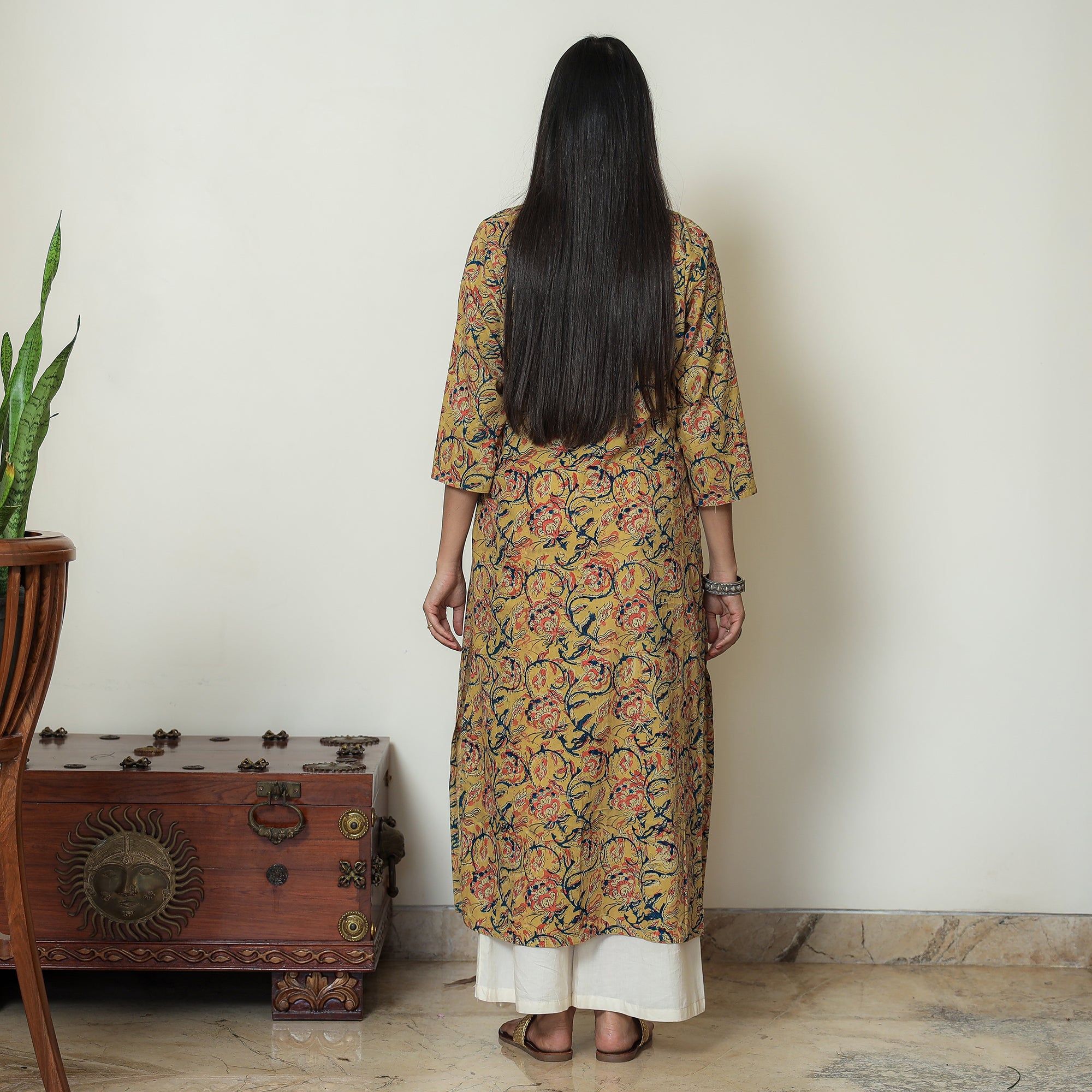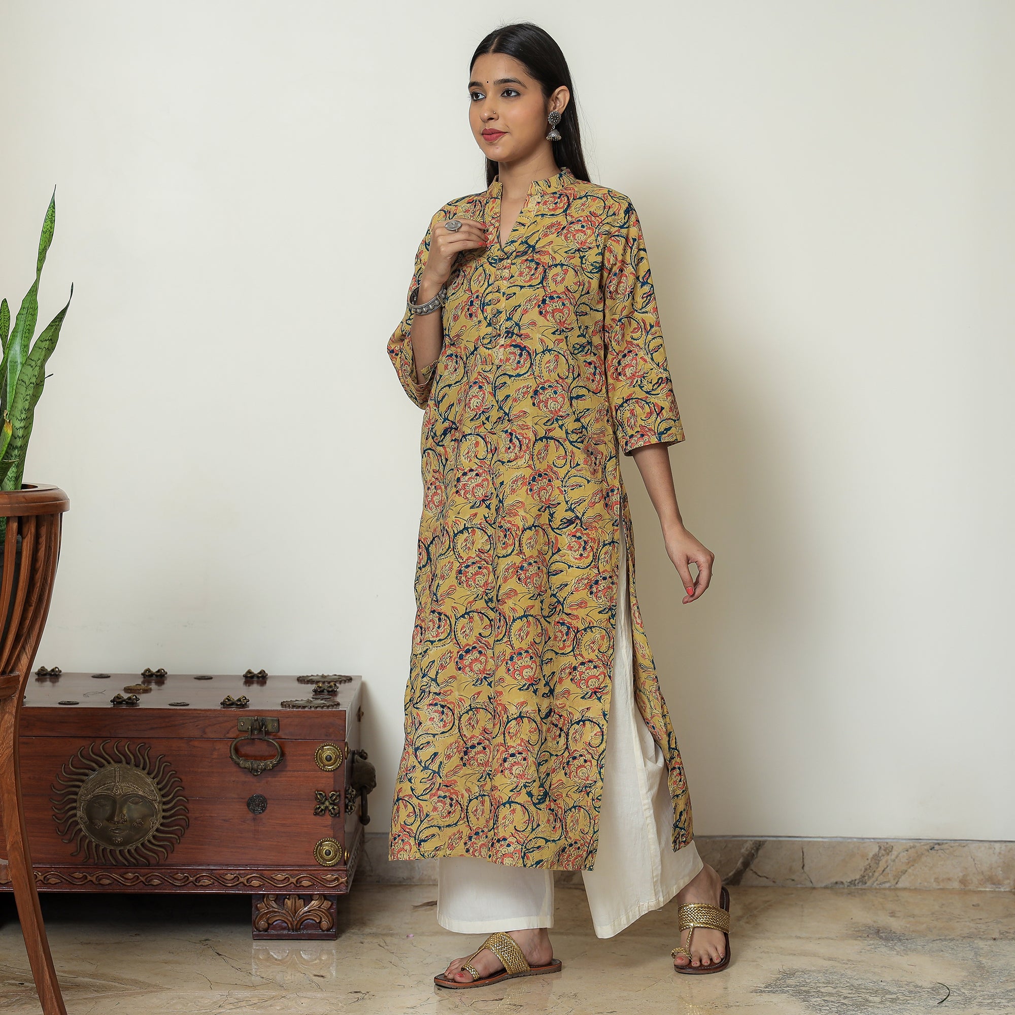 This uniquely designed yellow hand-block-printed cotton straight kalamkari kurta is a perfect blend of style and comfort. This kurta is crafted from natural-dyed cotton fabric, ensuring a comfortable feel against your skin. This kurta features intricate patterns created by hand-carved wooden blocks and a convenient one-side pocket, perfect for carrying small essentials. This cotton kurta makes you comfortable all day long. This kurta is perfect for your daily outing and for a special occasion.