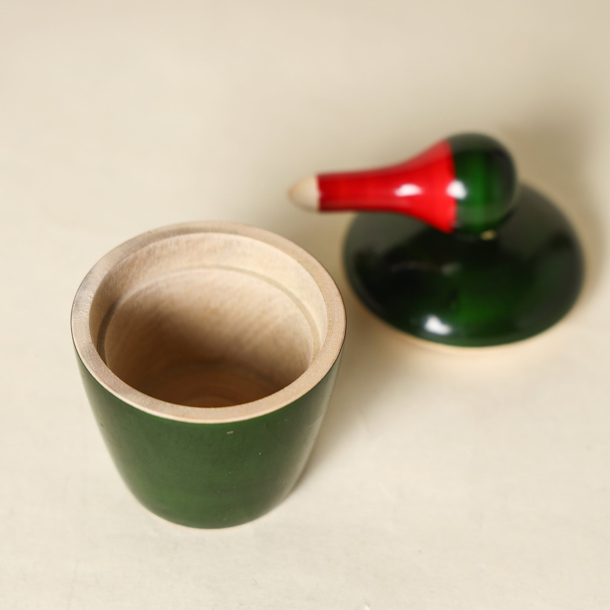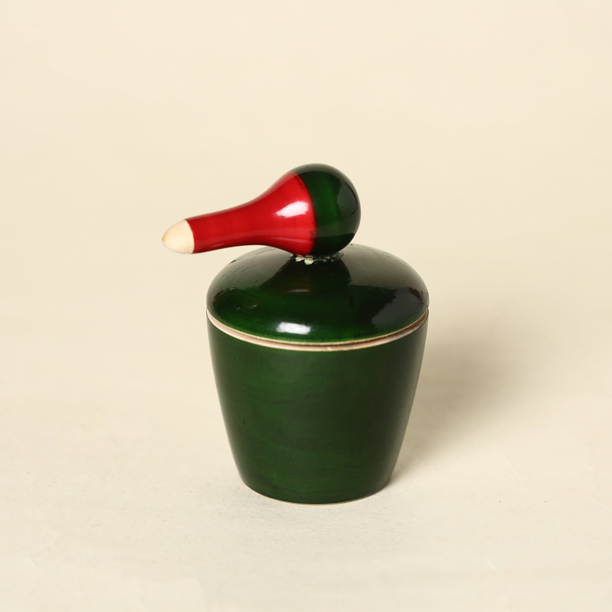 This traditional channapatna wooden kumkum box is handcrafted by the artisans of Ramanagar region of Karnataka. This kumkum box is handpainted with natural dyes. Colors are obtained naturally. Yellow color from turmeric; red color from kum-kum base; green color from vegetable leaf dye; orange color from saffron dye. This product is a lacware craft that is made of lac, a naturally available resin. This kumkum box is perfect for storing and carrying traditional vermilion powder for religious and cultural rituals.