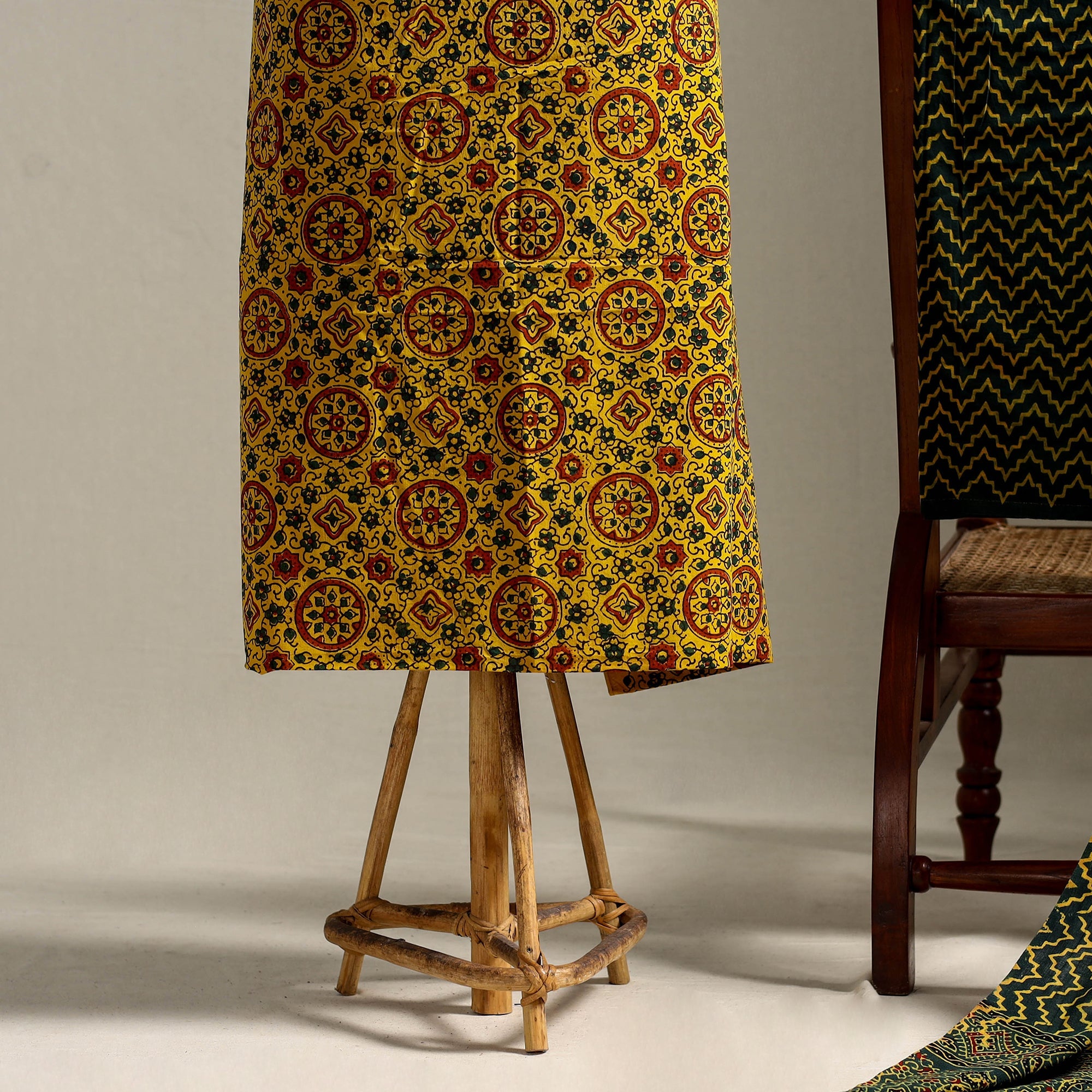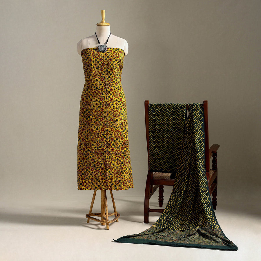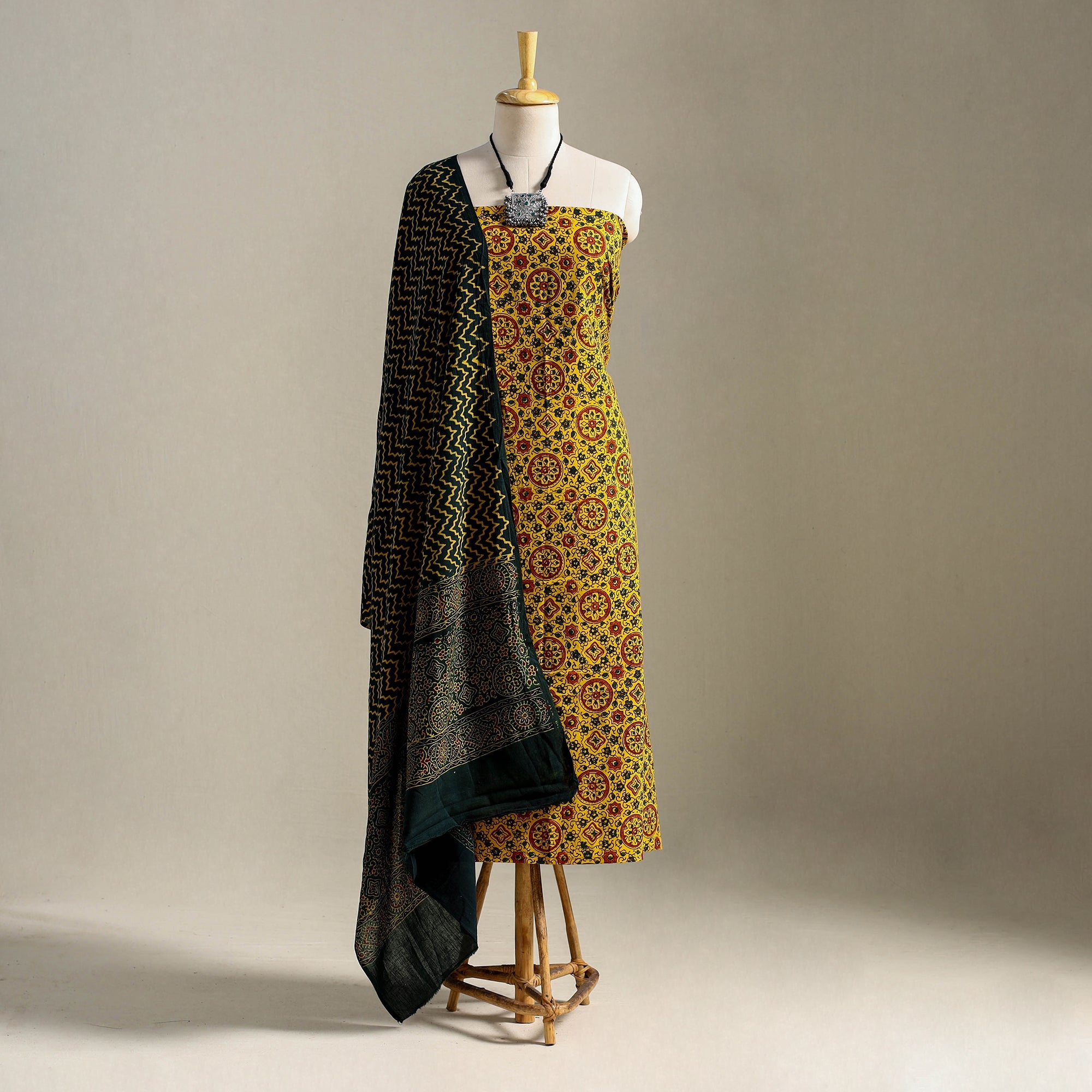 Fine quality yellow ajrakh hand-block-printed cotton 3pc suit material set from Kutch. This exquisite set is handcrafted with the utmost care and skill, showcasing the traditional ajrakh technique of hand block printing practiced by the skilled artisans in the Kutch region of Gujarat. The intricate patterns and vibrant colors on the cotton fabric create a perfect blend of elegance and comfort, making it ideal for any special occasion.